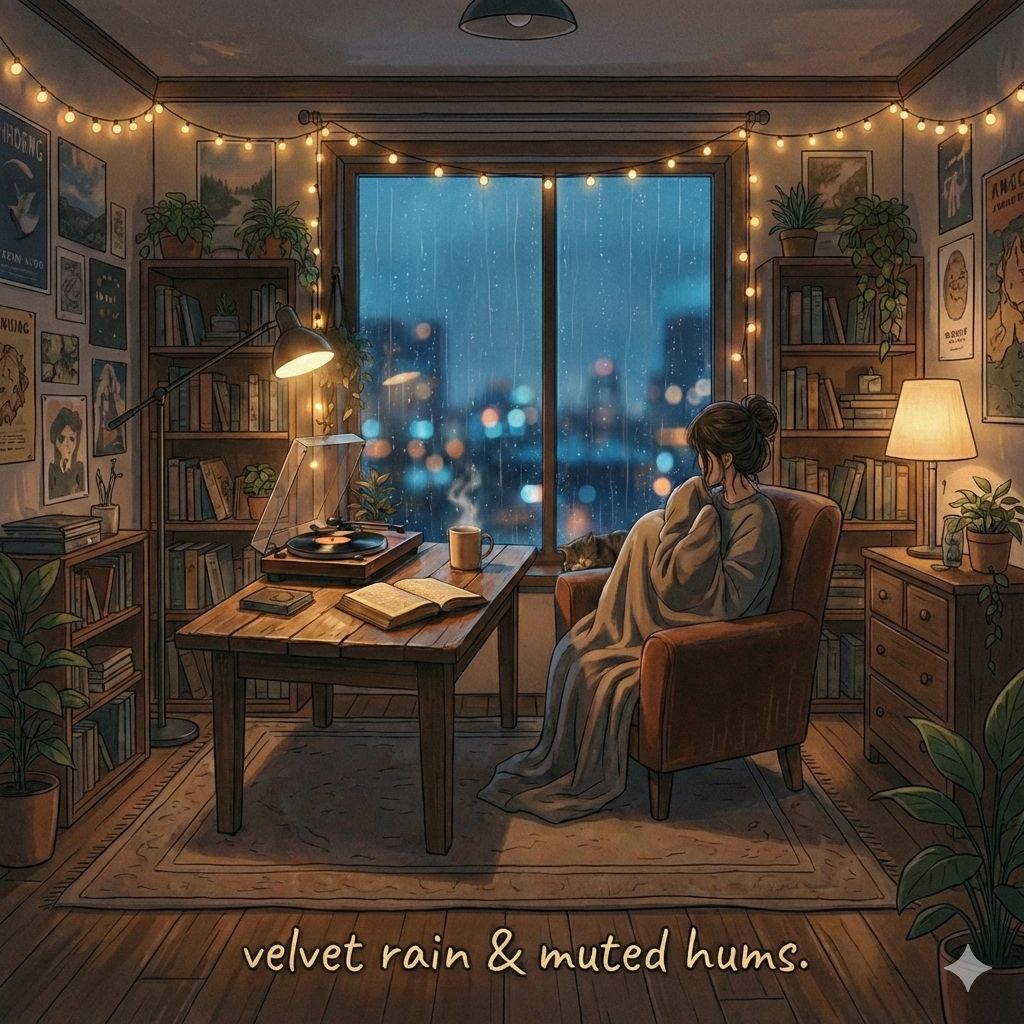Ultra Lo-Fi Chillhop, Smooth Jazz Hop, Rhodes Piano, Warm Vinyl Crackle, Rain Drops, Deep Sub Bass, Ethereal Female Humming, Soft Scatting, Minimal Lyrics, 70bpm