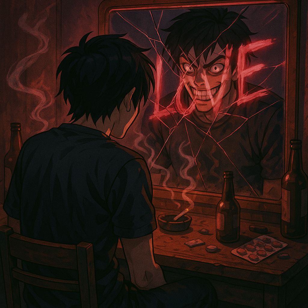 Deep, gravelly male vocals with a feral, unhinged undertone—clear, loud, and commanding, Delivery shifts between slow, stalking rap and sudden rapid-fire bursts, dripping with psychotic, murderous intensity, Southern rap cadence fused with metal aggression and bluegrass grit, Heavy, distorted 808 bass and trap drums hit like a heartbeat under pressure, layered with ominous piano and tense, cinematic strings, Horror and dark pop atmosphere soaked in reverb, creating a suffocating, haunted soundscape, Dual vocals emerge during emotional peaks—one raw and enraged, the other broken and echoing—amplifying inner chaos, The track feels dangerous, unstable, and theatrical, like a violent confession whispered and screamed at the same time, ‑mumbling
