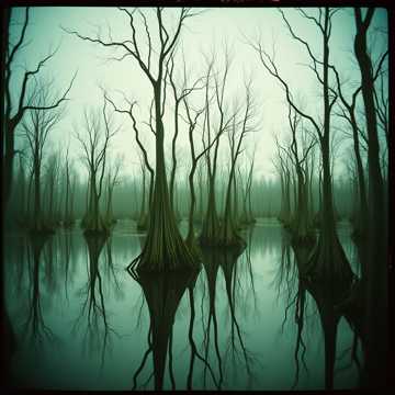 Sultry and sinister noir swamp funk jazz, Vibraphone haunting and rippling like surface water, syncopated upright bass, muted fender Rhodes, Moog synthesiser, mallet drums, and sparse swamp ambience, Tempo (~90 BPM), Southern Gothic feel, Chords: Cm – Cm♭5 – Am13♭5 – Ddim – Am6♭5 – Ab6/9 – G#6/9 – G7, Bridge: F♯m – Dmaj7 – E7 – G♯m♭5, NO GUITAR, NO SAXOPHONE, Vocal is gravelly and haunted, Mood: pensive and haunted