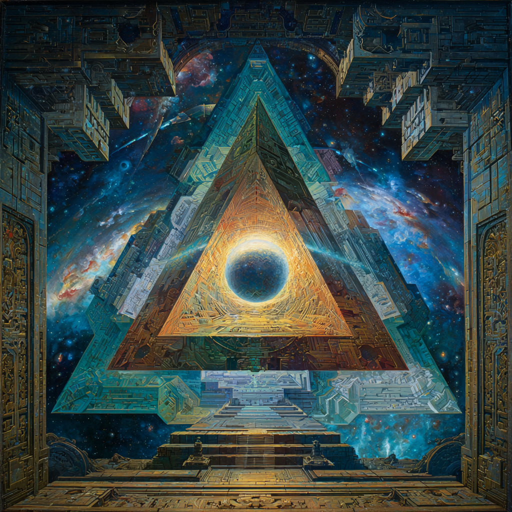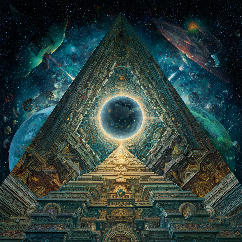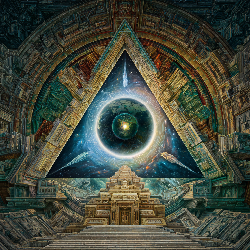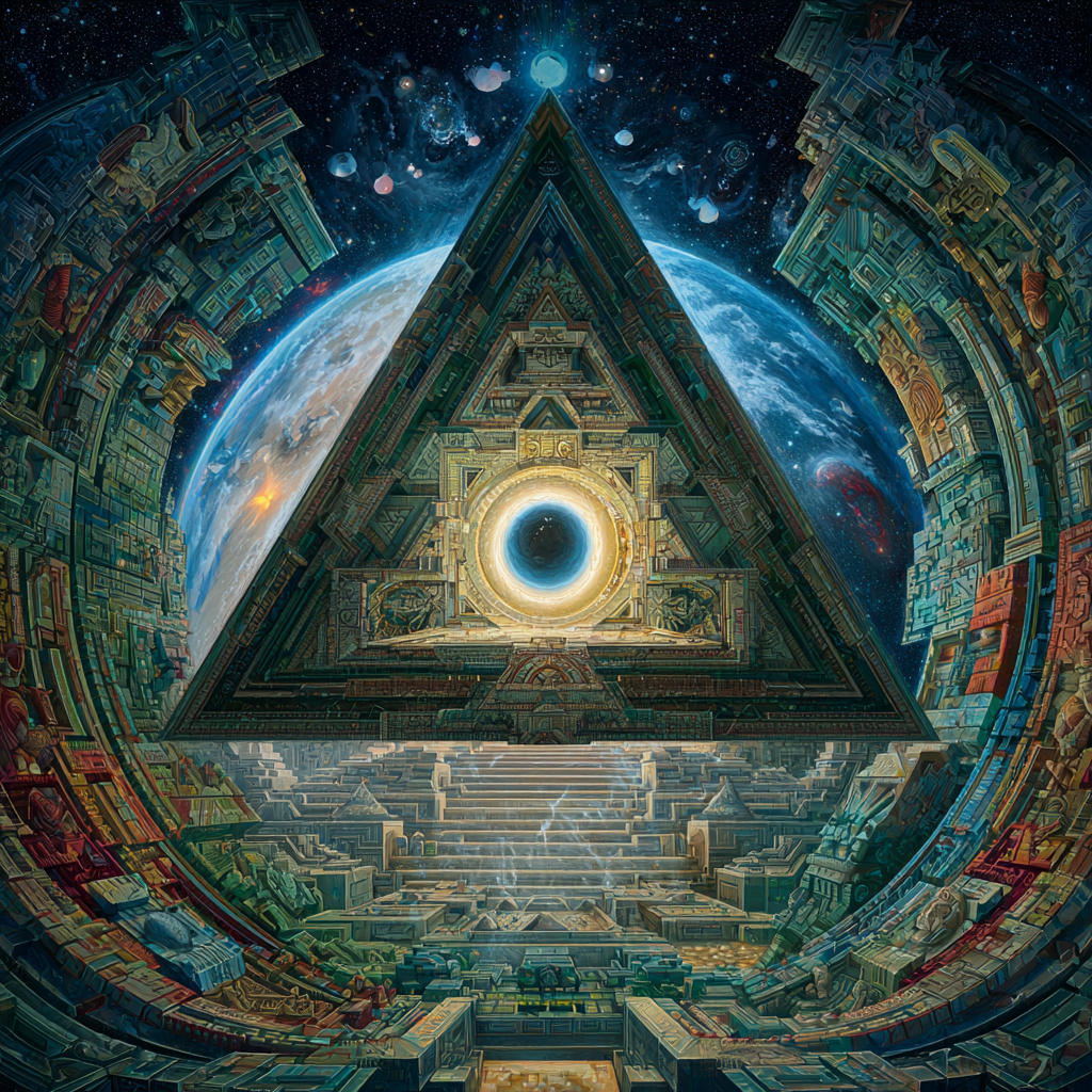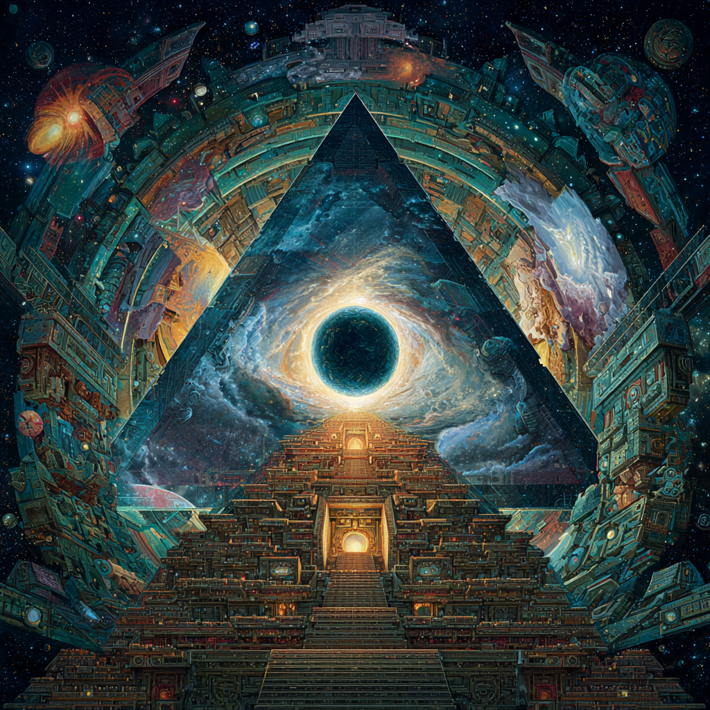 Experimental slow space music, polyphonic madrigal structures reimagined through analog synthesizers, Cosmic music, space music harmonies, Intricate tribal drum patterns, Intricate layered electronic textures maintaining Renaissance counterpoint principles, Lute-like arpeggios generated by sequenced synthesizers, Ornate, mathematically precise composition blending period authenticity with futuristic sound design