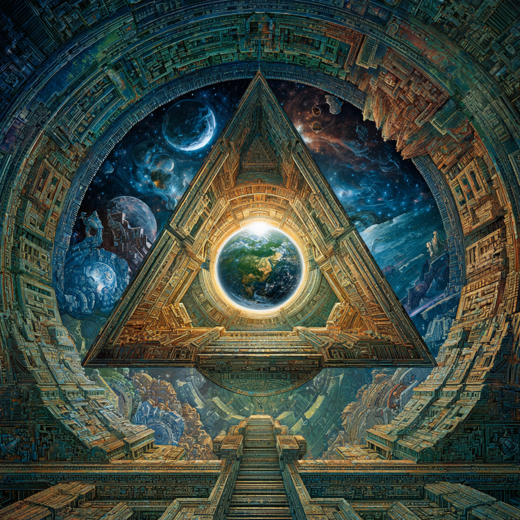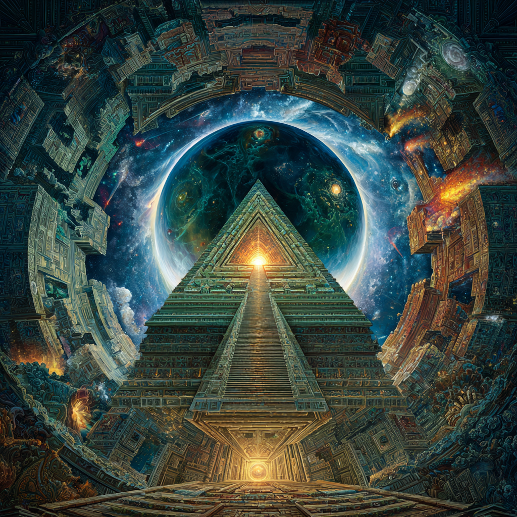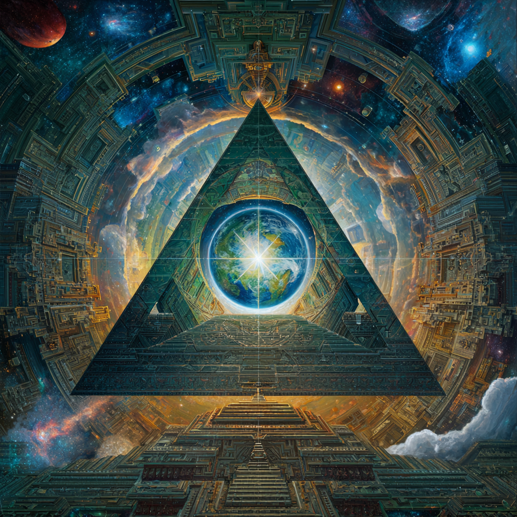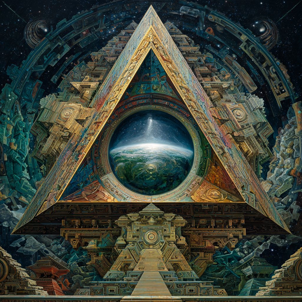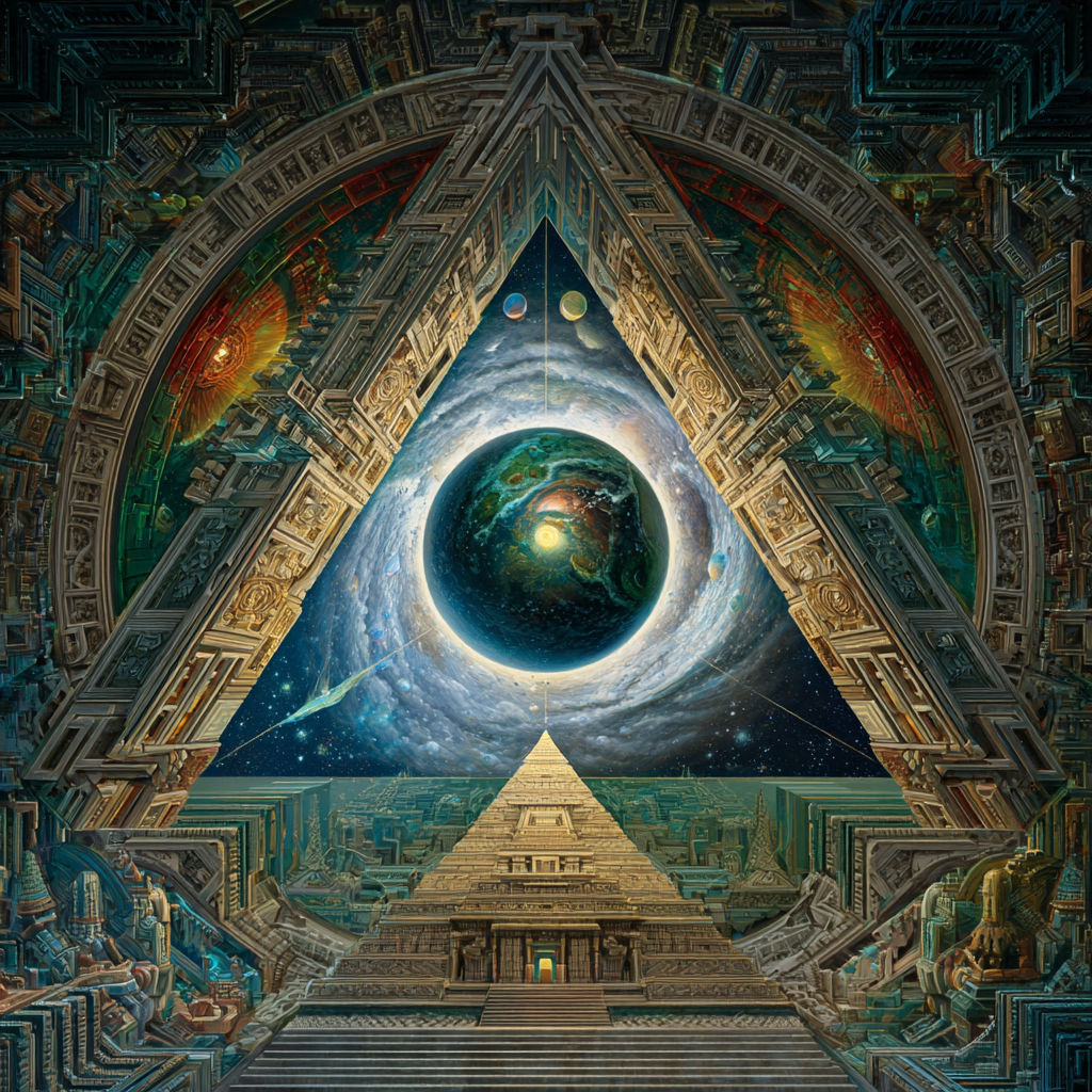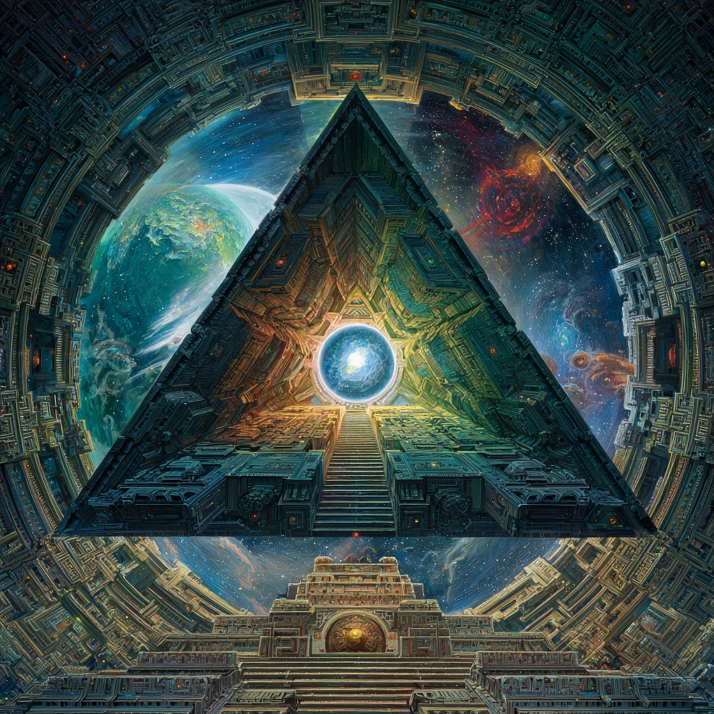 Experimental slow space music, polyphonic madrigal structures reimagined through analog synthesizers, Cosmic music, space music harmonies, Intricate tribal drum patterns, Intricate layered electronic textures maintaining Renaissance counterpoint principles, Lute-like arpeggios generated by sequenced synthesizers, Ornate, mathematically precise composition blending period authenticity with futuristic sound design