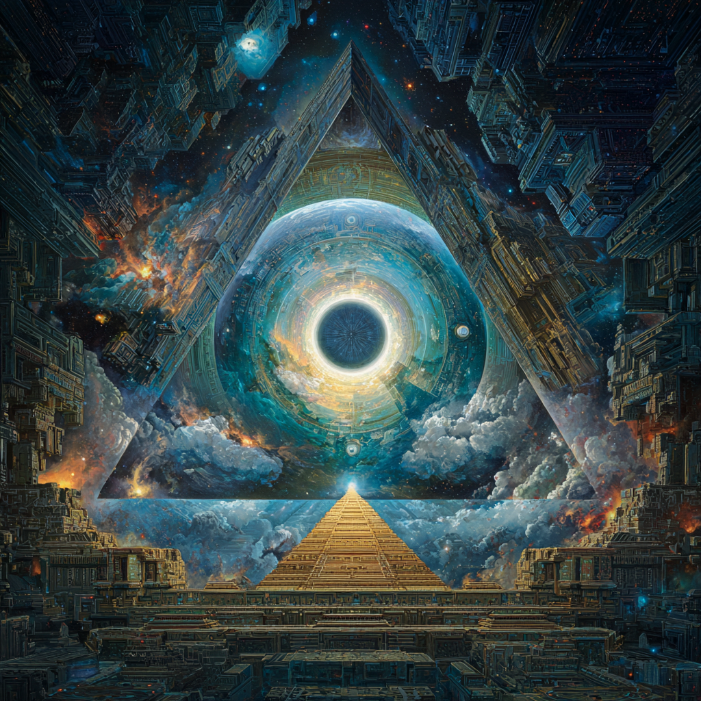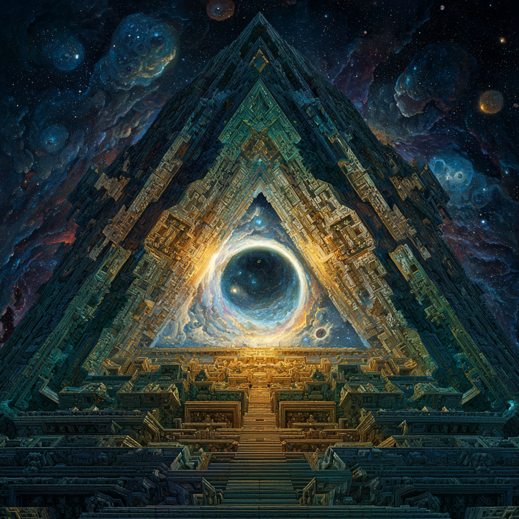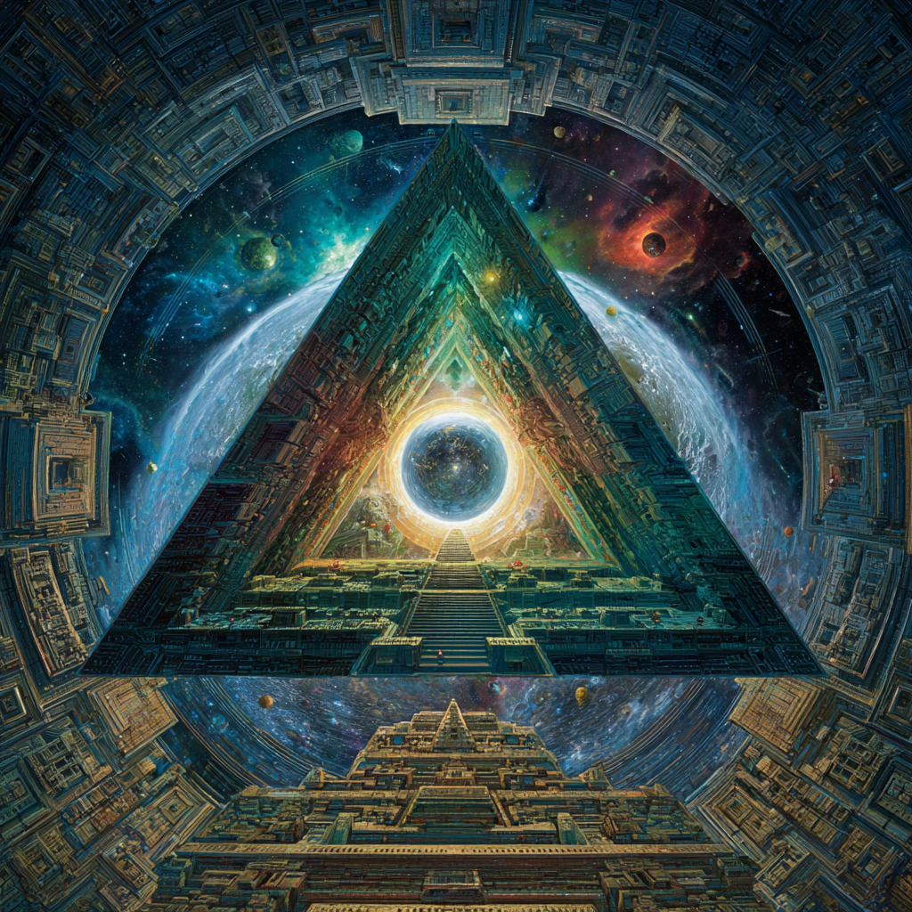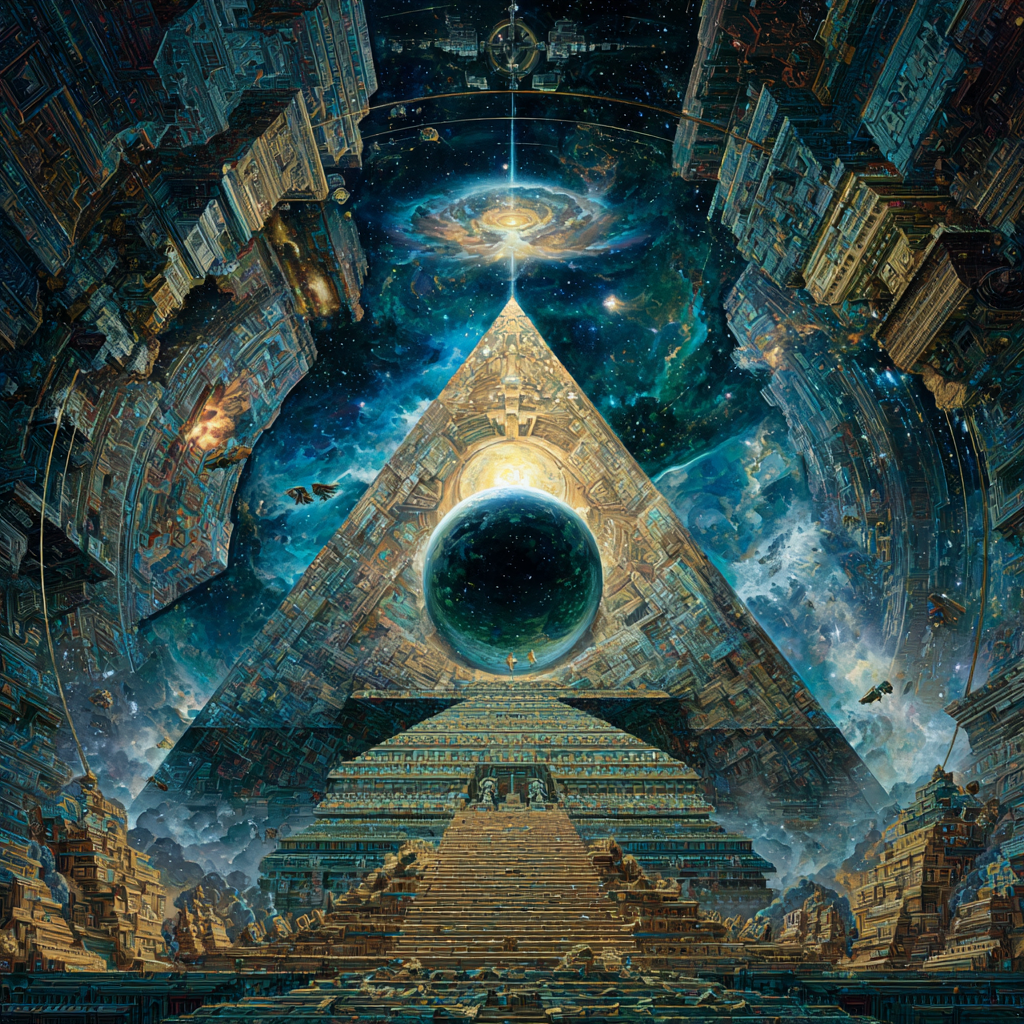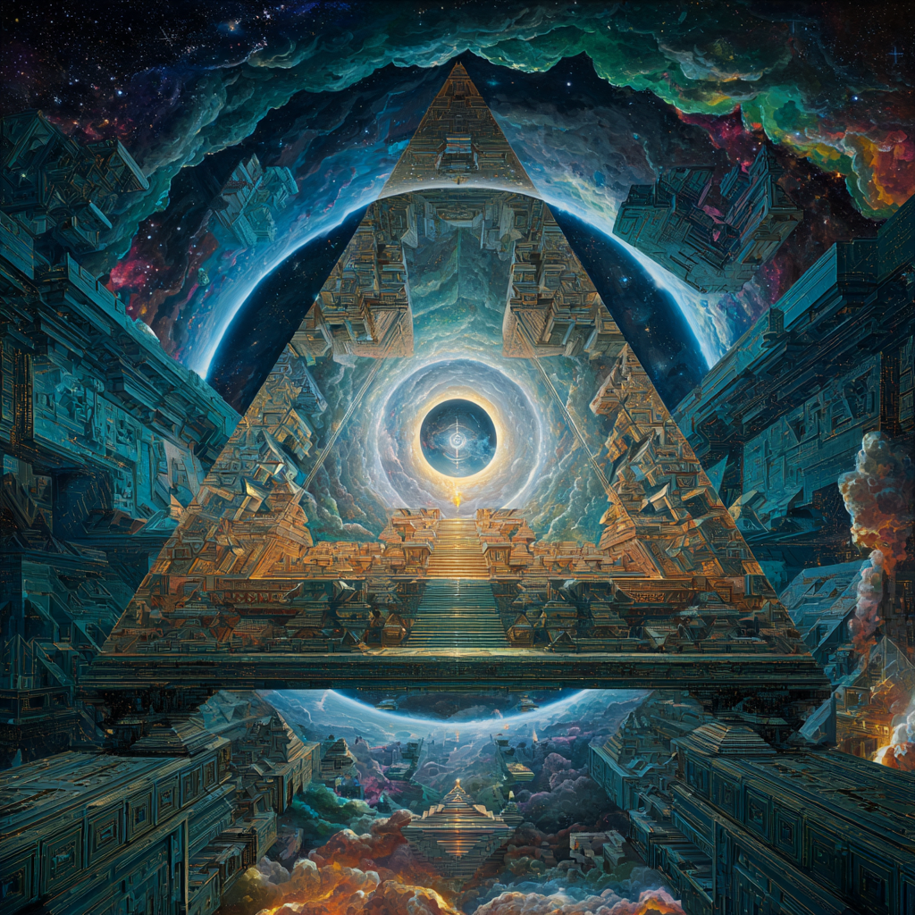 Experimental slow space music, polyphonic madrigal structures reimagined through analog synthesizers, Cosmic music, space music harmonies, Intricate tribal drum patterns, Intricate layered electronic textures maintaining Renaissance counterpoint principles, Lute-like arpeggios generated by sequenced synthesizers, Ornate, mathematically precise composition blending period authenticity with futuristic sound design