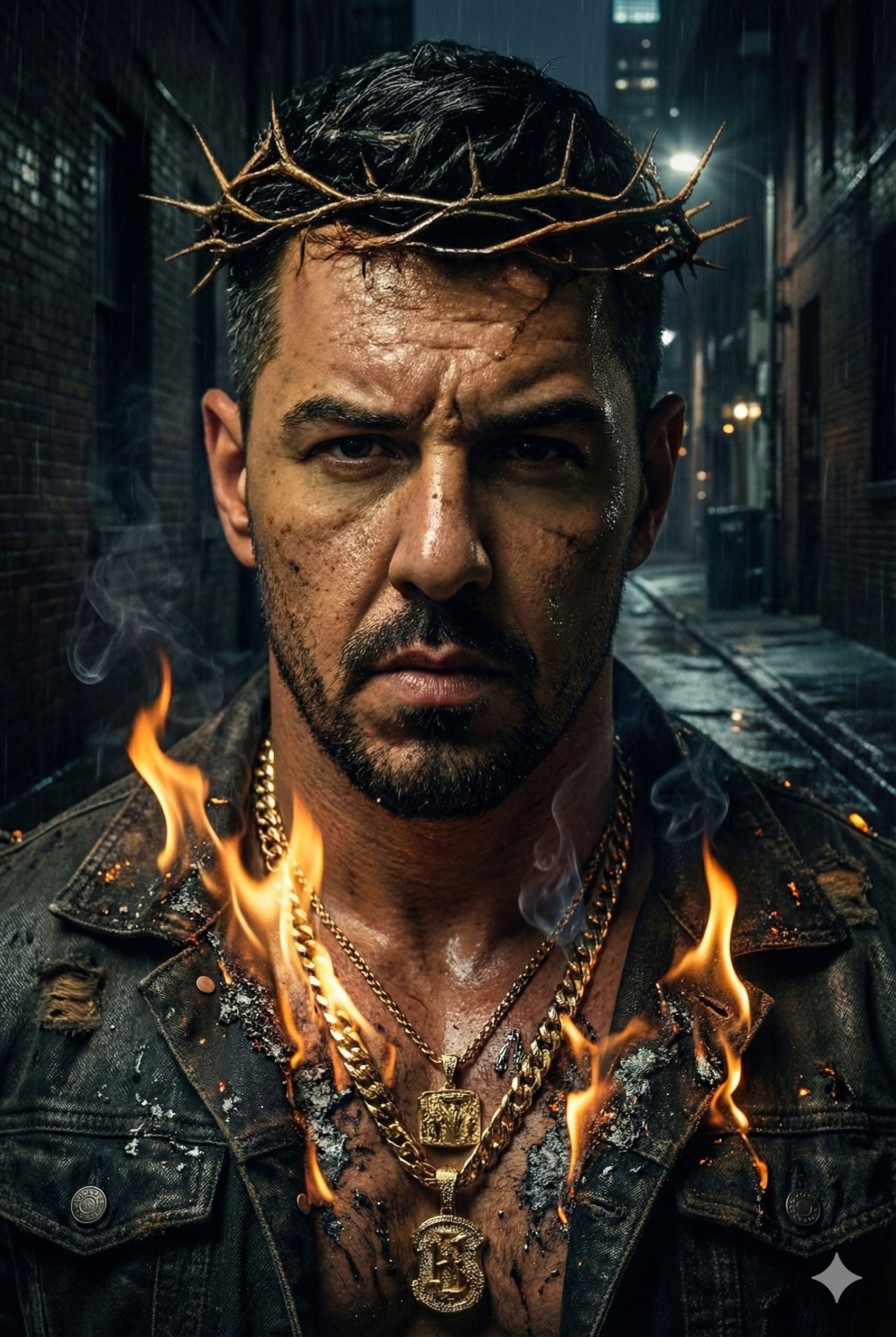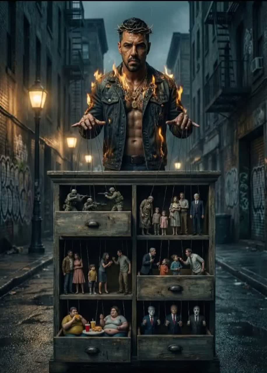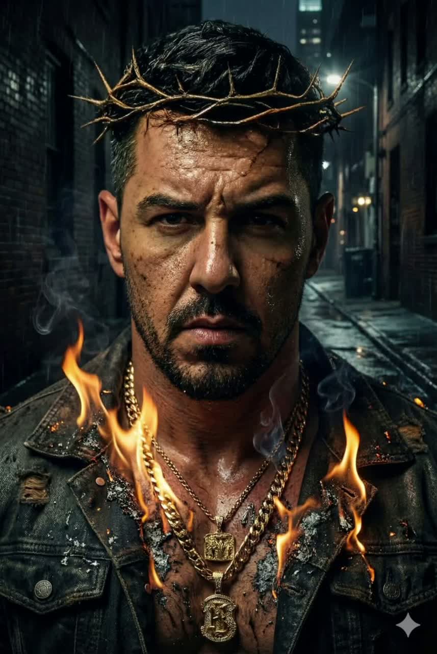 Create a dark street-soul hymn layered over a warm, classic Stevie-Wonder-style groove, Deep male voice, clear, gritty, powerful, No mumbling, Add oracle-style spoken lines, breath-ins, breath-outs, emotional growl, Smooth soul chords meet heavy subbass waves, cinematic brass swells, fire-like impacts, tight rimshots, subtle vinyl crackle, Fuse old-school soul warmth with modern street energy: wide choirs, shadowy pads, echoing ad-libs, fast double-time phrases cutting through the soft groove, Keep tension rising: soft on the surface, war underneath, Add dramatic breaks, heartbeat bass pulses, reverse swells before every drop, Contrast should feel like light vs, storm—Stevie-soul brightness against your dark epic fire