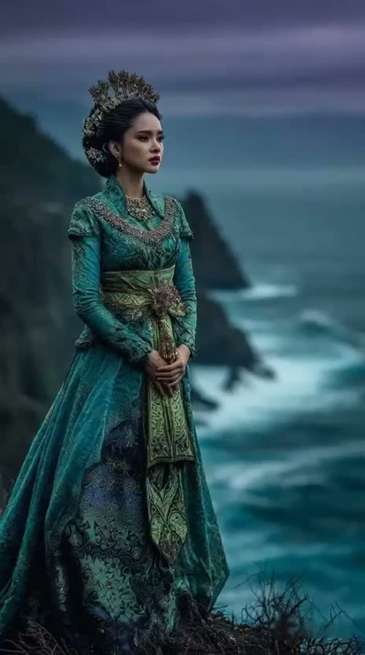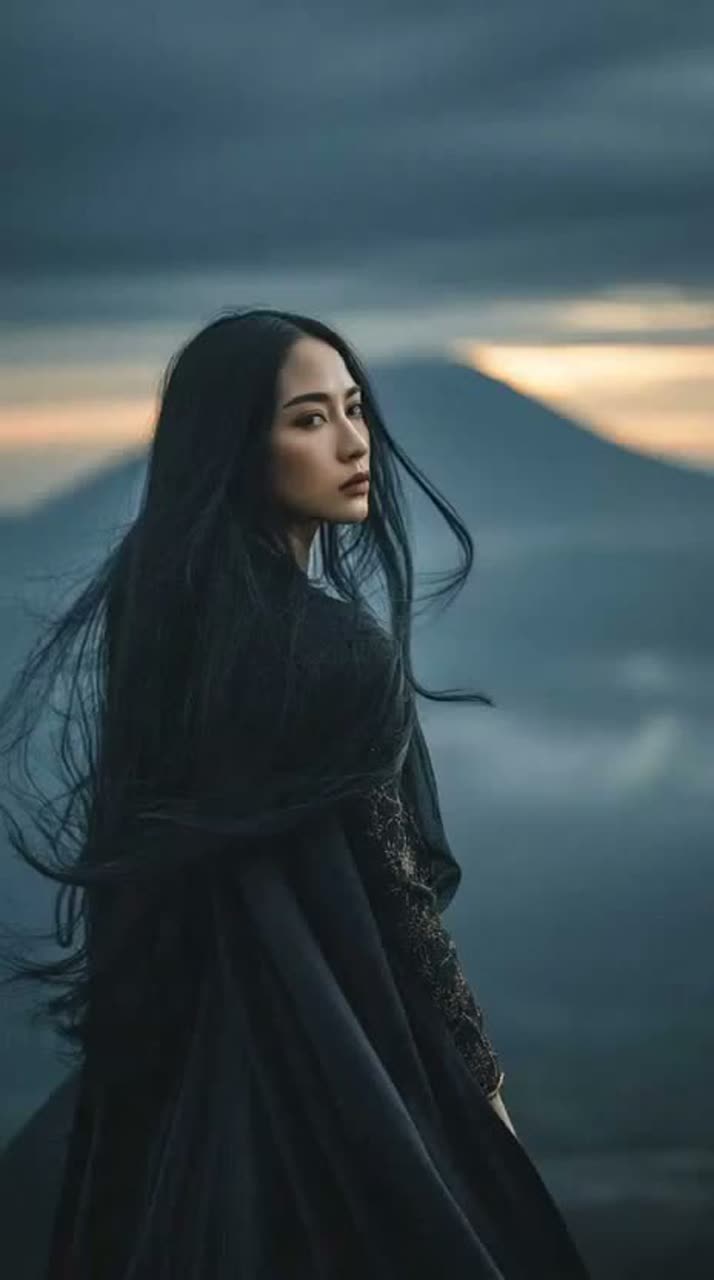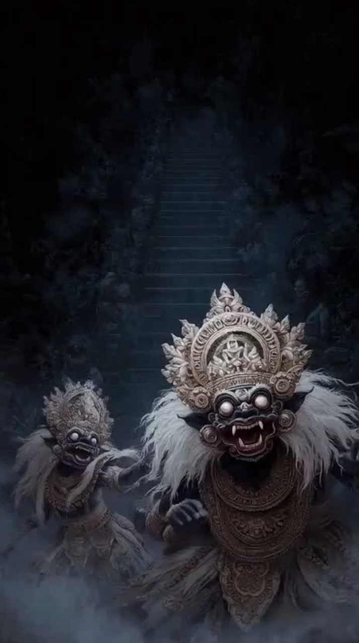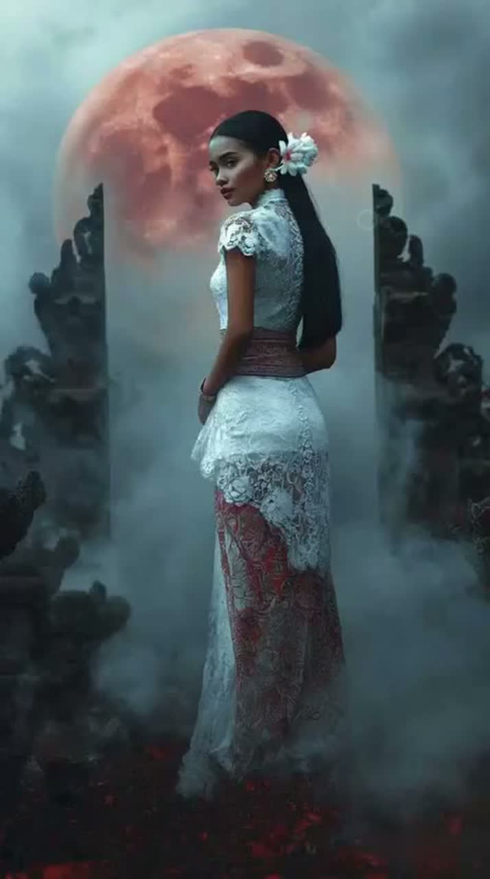 Balinese Gamelan fuse with Progressive Metal masterpiece, powerful female lead, Fusion of black metal, death metal and authentic Balinese gamelan ritual elements, Cinematic integration of Gamelan Pelog instruments (gongs, metallophones) and intense rhythmic Kecak chanting (cak-cak-cak polyrhythms), Vocals: operatic soprano, haunting whispers, and aggressive gritty belts, Instrumental: transition from heavy down-tuned guitar riffs to a tribal Kecak dance interlude with rhythmic breathing and hand-clapping sounds, Progressive odd-meter breakdowns, double-pedal blast beats, and dark orchestral layers, Vengeful, mystical, and ritualistic horror atmosphere, Soundscape: deep ritual bells, shimmering gamelan textures, and dissonant strings, Balinese gamelan and culture from start to end