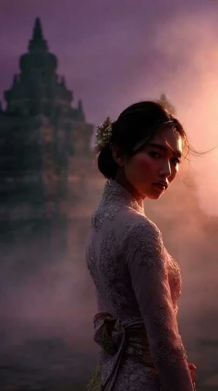 High-energy fusion of traditional Javanese Gamelan and modern Progressive metal and Metalcore, The track opens with haunting female Javanese vocals (sinden style) featuring melisma over gamelan, atmospheric pads, and dynamic Javanese kendang rhythms, It suddenly drops into heavy metalcore: down-tuned palm-muted guitar chugs, fast double-kick drums, and gritty high-pitched fry screams, Polished modern production, wide stereo, punchy drums, clear separation of ethnic and distorted elements, minor key with Phrygian dominant feel, Vocal female high pitch, belting, falsettio, Bridge: instruments stop—only dark ambient and soft gamelan remain, with eerie haunting sinden vocals