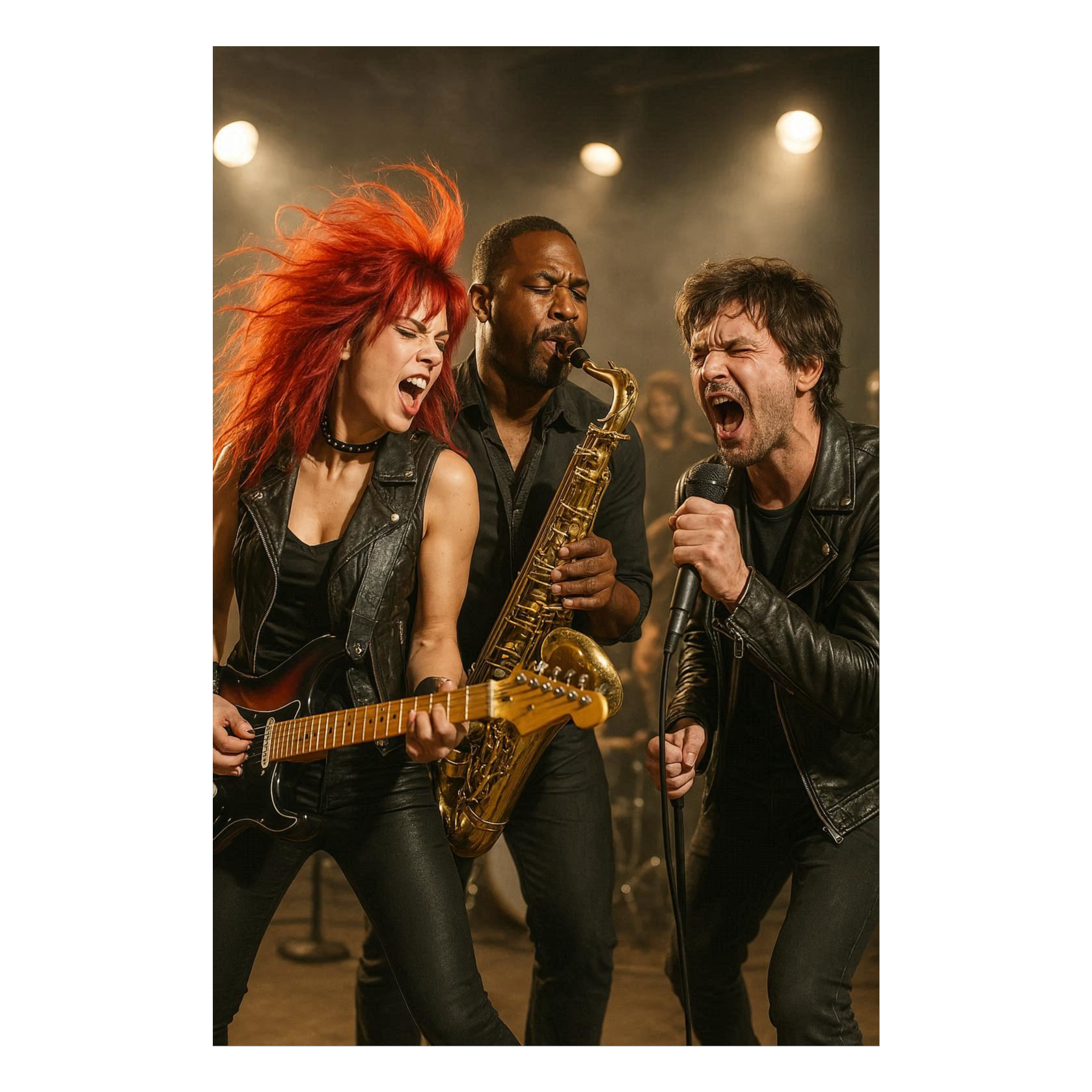 Imagine the electrifying energy of a live rock concert, filled with roaring electric guitar riffs, a powerful driving bass line, and thunderous drum grooves that keep the momentum alive from start to finish, Layered over this high-octane rock foundation, a soaring jazz saxophone emerges, cutting through the wall of sound with bold, improvisational phrasing that blends expressiveness, sensuality, and raw fire, The saxophone solo expands in dynamic waves—sometimes smooth and melodic, sometimes wild and untamed—bringing a surprising jazz spirit into the rock arena, The music should feel like a unique collision of genres: the explosive power and grit of classic rock fused with the fluid sophistication and spontaneity of jazz improvisation, Imagine the atmosphere of a massive stadium drenched in energy, where the crowd is swept away by a rare instrumental journey that is both powerful and soulful, modern yet timeless, loud yet intricately musical