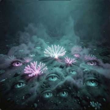 submerged coastal trance, ambient chillstep, Dorian-leaning with subtle Mixolydian color bleed, tempo ~120 BPM, rhythm breathes and pulses slowly, never forming a defined beat, no swing, no humanization, no hard transients, no defined kick, sub presence acts as ocean pulse, movement implied through pressure, not percussion, tonal center drifts, harmony suspended and unresolved, light briefly emerges then dissolves, pads airy and lowpassed, soft mallets and felt piano bloom into long diffused reverb, primary arp wet, hazy, drifting, non-emphasized, ghost motion and delays create subtle temporal parallax, elements slightly misaligned, as if heard through water, no drops, no impact transitions, energy remains submerged, vocals distant, wet, echoing through liminal space, treated as presence not lead