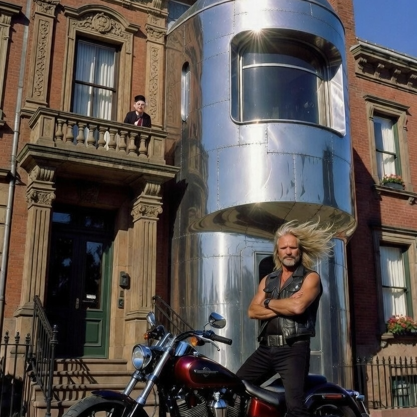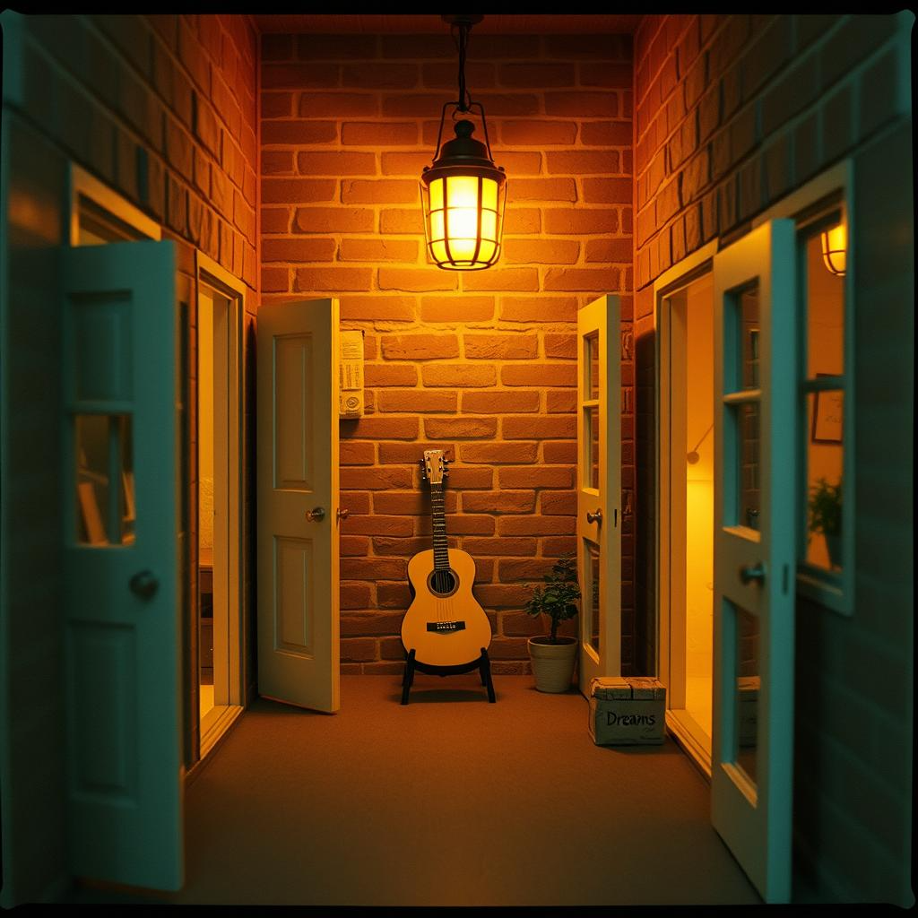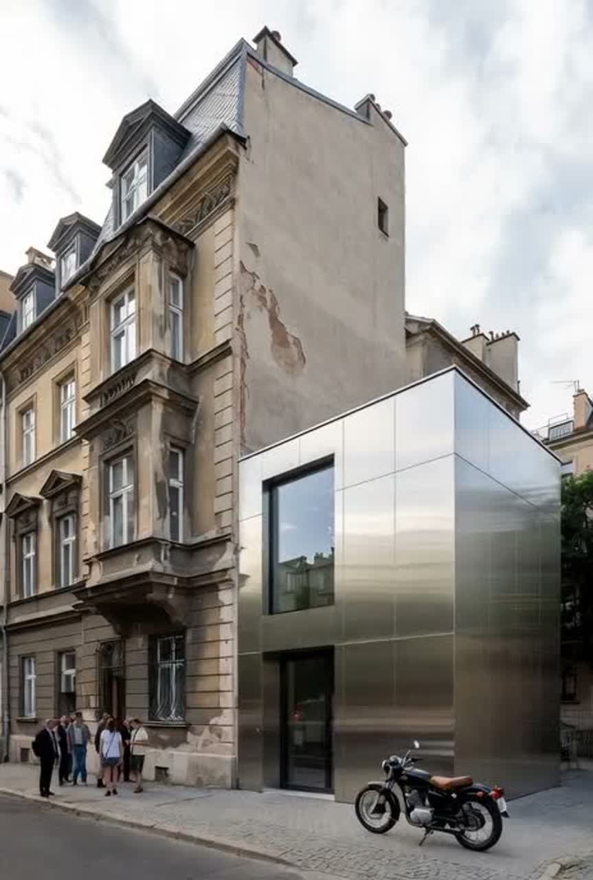 A quirky, humorous, and catchy Indie Pop / Lo-Fi Rock, heavy metal sound track, Driven by an acoustic guitar, a bouncy bassline, and percussion that sounds like banging on pots and metal sheets, The male vocal is relaxed, ironic, and conversational (storytelling style), The lyrics describe a "creative tenement house" challenge, focusing on a funny, ugly metal annex attached to a beautiful old building, Mood: humble, funny, and creative