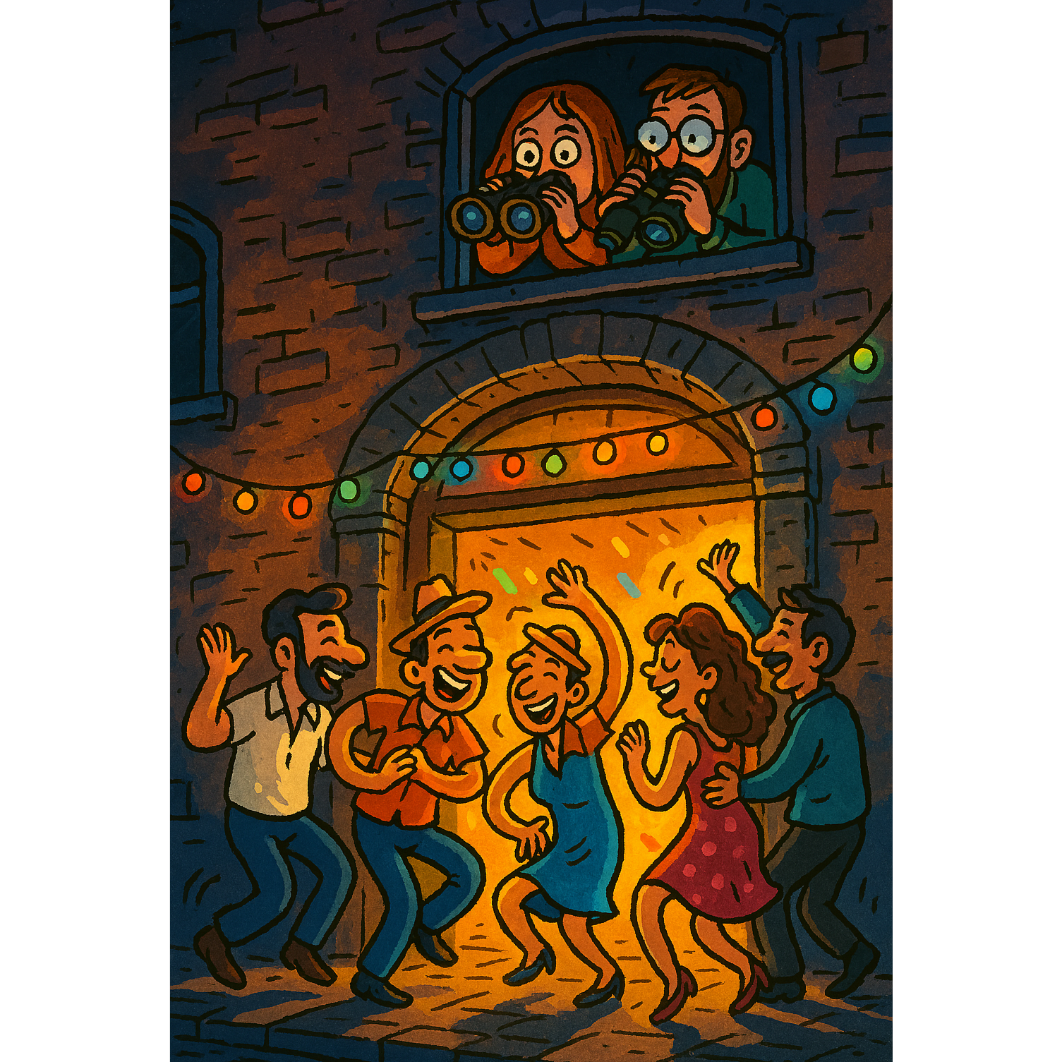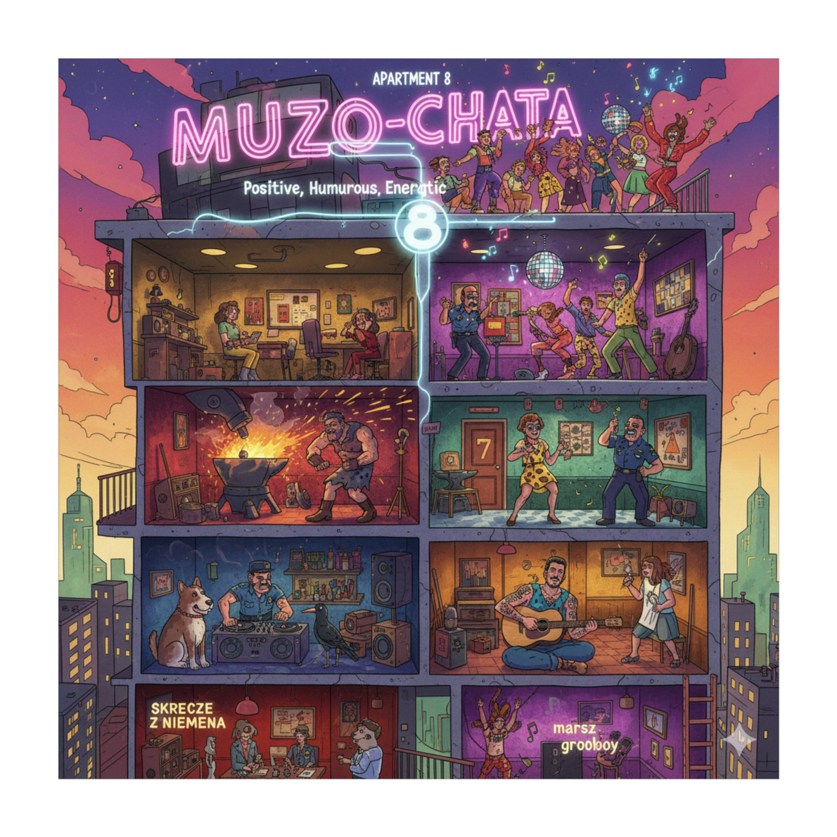 Salsa fusion, wesoła i chaotyczna, Latynoski rytm połączony z podwórkowym humorem, Bongosy, conga, cowbell, gitara latino, akordeon, klarnet, żywy bas, Energia starej kamienicy: śmiech, echo z piwnicy, imprezowy vibe, Tempo średnie, taneczne, Refren rytmiczny „bum‑ba, bum‑ba”, Klimat spontaniczny, lekko pijany, pełen charakterów