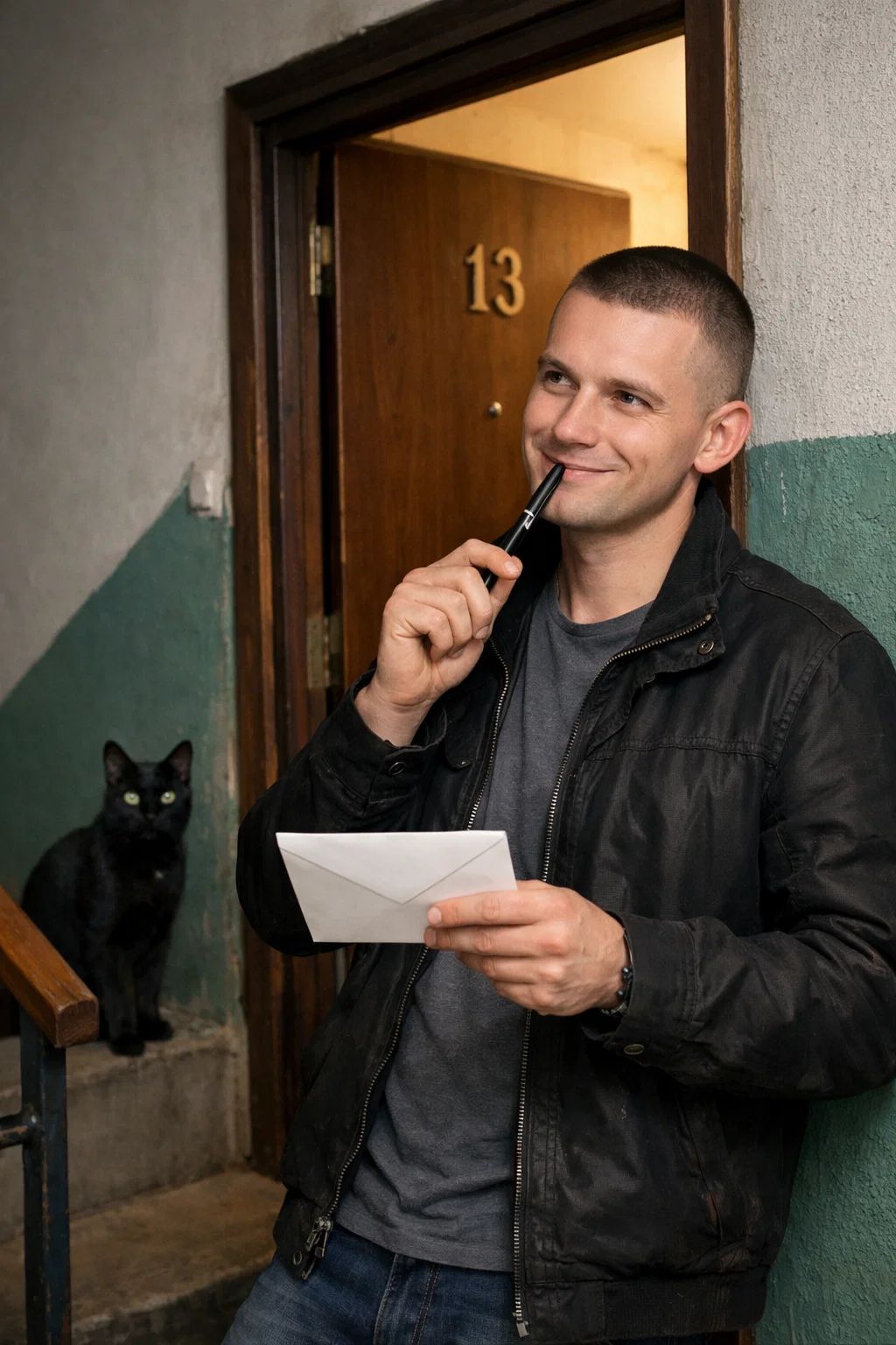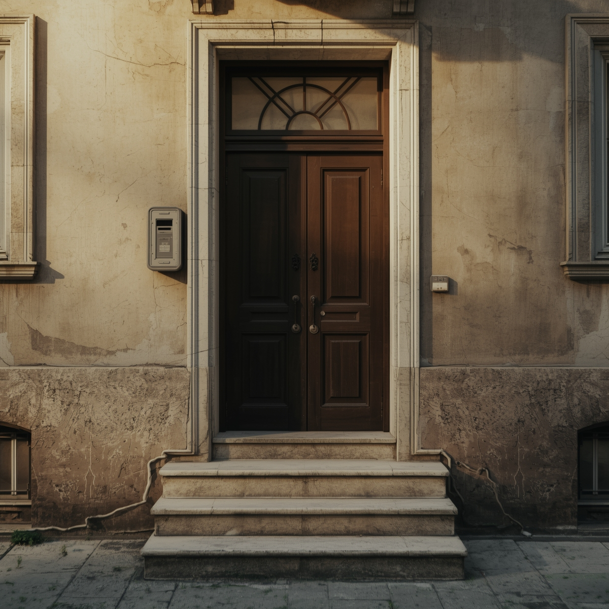 Dark, unsettling darkwave mixed with industrial ambient and post-punk atmosphere, Polish lyrics, structured like an inner monologue of a patient, predatory ghost observing new tenants in an old apartment building, Mood tense, intrusive, psychologically aggressive but restrained, Sparse arrangement: deep sub-bass pulse, cold synth drones, distant metallic hits, creaking wood, pipe noises, occasional dissonant guitar or synth stabs, Tempo slow to medium-slow, hypnotic and oppressive, with pauses that build tension, Atmosphere claustrophobic, like night in an empty stairwell of an old building, Male vocal – deep and rough, gravelly preacher tone with slight distortion and tape saturation, southern accent, half-sung half-spoken like a haunted sermon, Vocals intimate and close, as if whispering directly into the listener’s ear