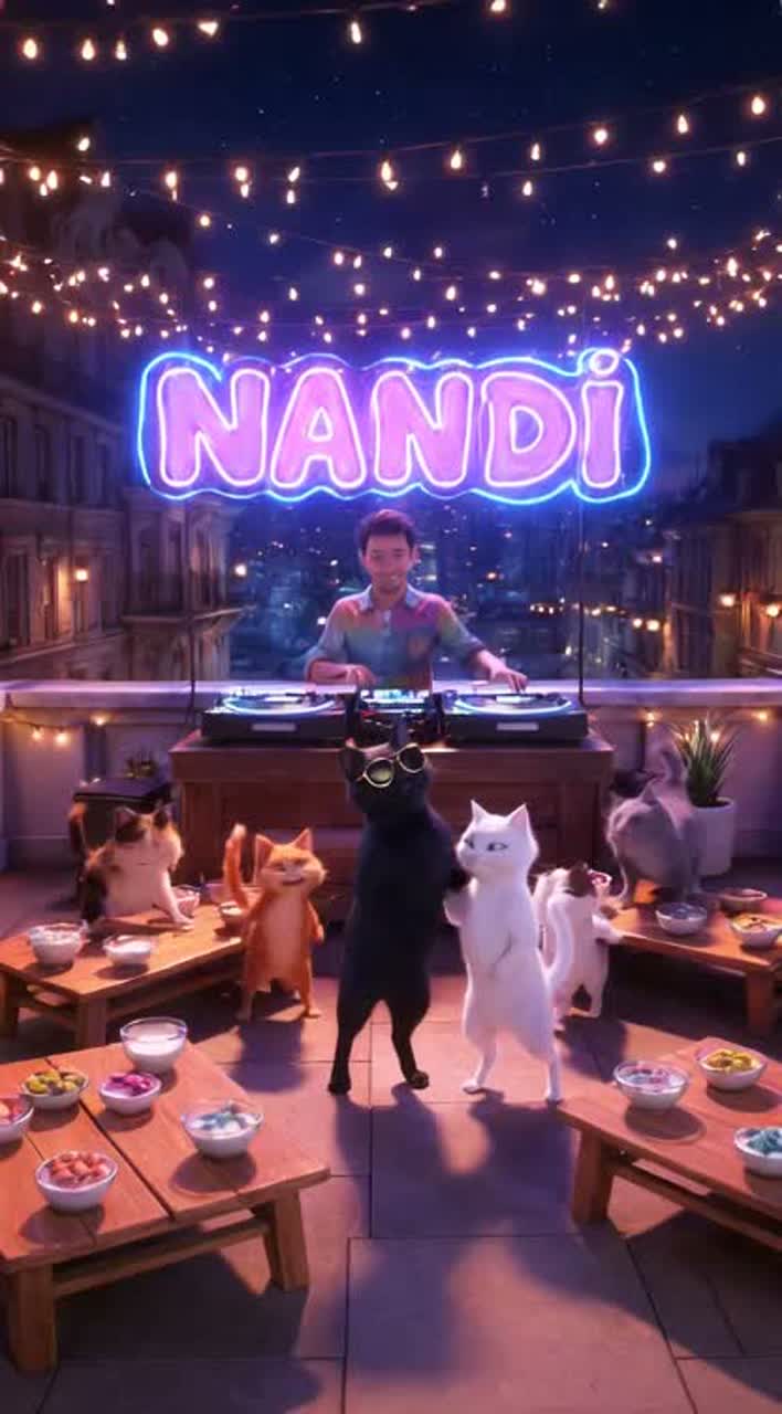 Uplifting Nu-Disco and Funky House groove, fast and danceable 122 BPM, Punchy four-on-the-floor drum beat, funky "slap bass" line, and bright rhythmic electric guitar stabs, Background features sparkly disco synths and celebratory handclaps, Vocals: Charismatic male voice, energetic and playful rap-singing, Backing vocals: High-energy female "meows" and a catchy, soulful gospel-style chorus, Atmospheric sounds: Sound of popping corks, cheerful party chatter, and rhythmic cat purrs synced to the beat, Quality: Crystal clear modern production, vibrant and loud, Tags: #DiscoCat #SaturdayParty #NandiDancefloor #Energy #KreatywnaKamienica #NoGossipJustDance
