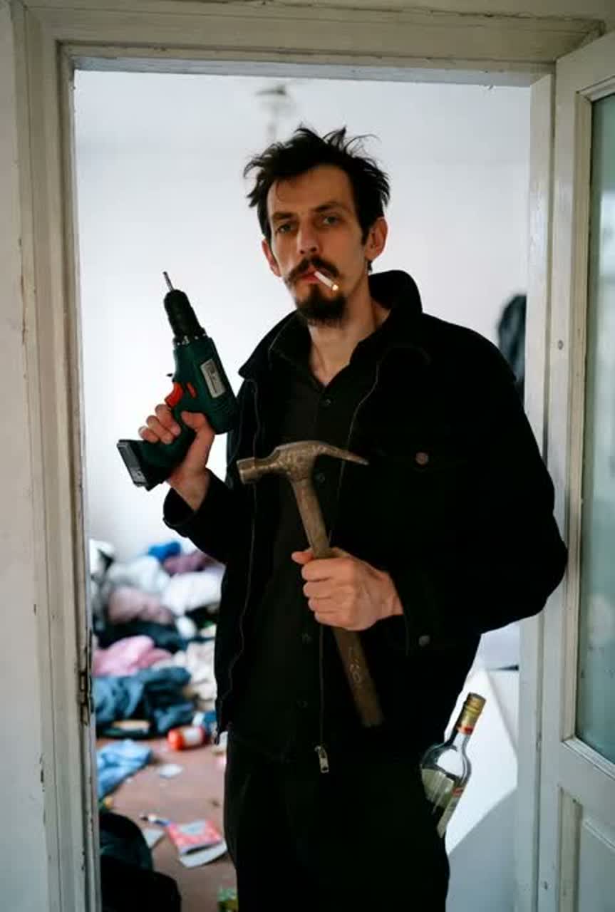 Energetic, street-style track with a playful, party vibe, medium-fast tempo, Vocal should be lively, cheeky, and expressive, either male or female, emphasizing local, urban, apartment-living humor, Instruments: synthesizers, light bass, electronic drums, subtle background samples like hammering or drilling to match the renovation theme, Lyrics tell a story about moving into a run-down apartment, doing renovations, throwing a housewarming party, helping a neighbor, and creating your own space in a gritty, street-style environment, Chorus should be catchy, melodic, easy to sing, Keep humor, lightness, and slight absurdity of street life; avoid strong profanity