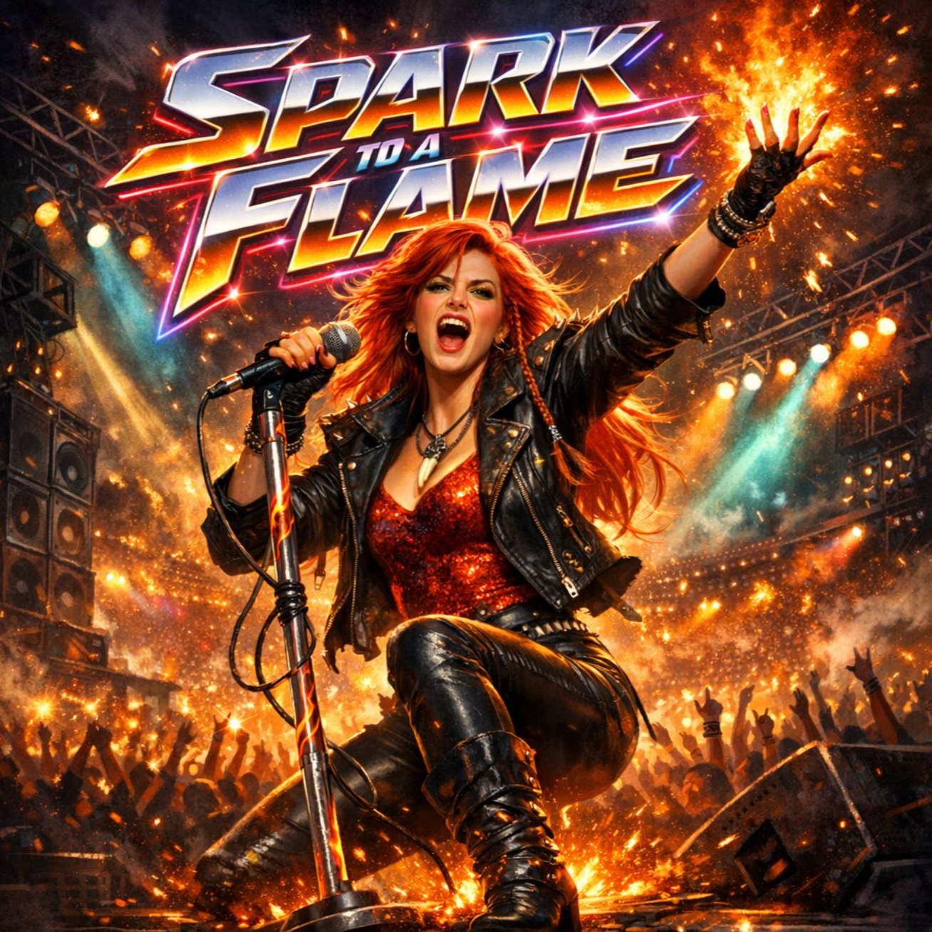 1988 Glam Rock / Stadium Pop-Rock, A massive and anthemic production featuring a powerful, raspy female lead vocal with high emotional drive, The sound is characterized by huge gated reverb drums, thick analog synthesizer pads, and driving electric guitars that alternate between percussive stabs and soaring melodic leads, The arrangement is epic and cinematic, designed for large arenas, Background vocals provide rich, stacked harmonies during the chorus, The tempo is a confident mid-to-fast 4/4 beat (approx, 128 BPM), The overall mood is one of triumph, energy, and sudden transformation, avoiding digital cleanliness for a warm, powerful 1980s radio-hit production