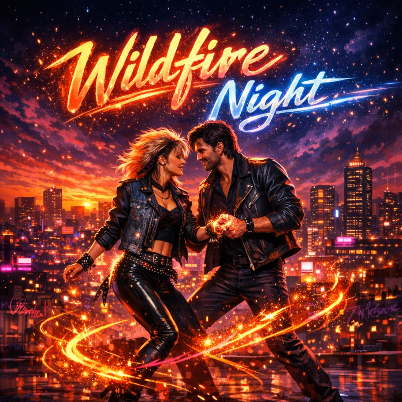 1989 Synth-Wave Pop / Dance-Rock, A vibrant, high-energy production featuring a powerful Female/Male Duet, Vocal Description: The female voice is strong, raspy, and soulful (reminiscent of a rock-pop icon), while the male voice is a rich, slightly gritty baritone with a classic 80s rock edge, They harmonize perfectly in the choruses, The arrangement is driven by pulsing FM synthesizers, a steady "four-on-the-floor" electronic beat with heavy gated reverb on the snare, and shimmering arpeggios, Bright electric guitar stabs add a rhythmic funk-rock layer, The song structure builds from an atmospheric intro to a massive, euphoric, and extremely catchy pop-rock chorus, The mood is celebratory, rebellious, and cinematic, Tempo: 124 BPM, Analog warmth and wide stereo imaging are essential to capture the late 80s radio-hit aesthetic