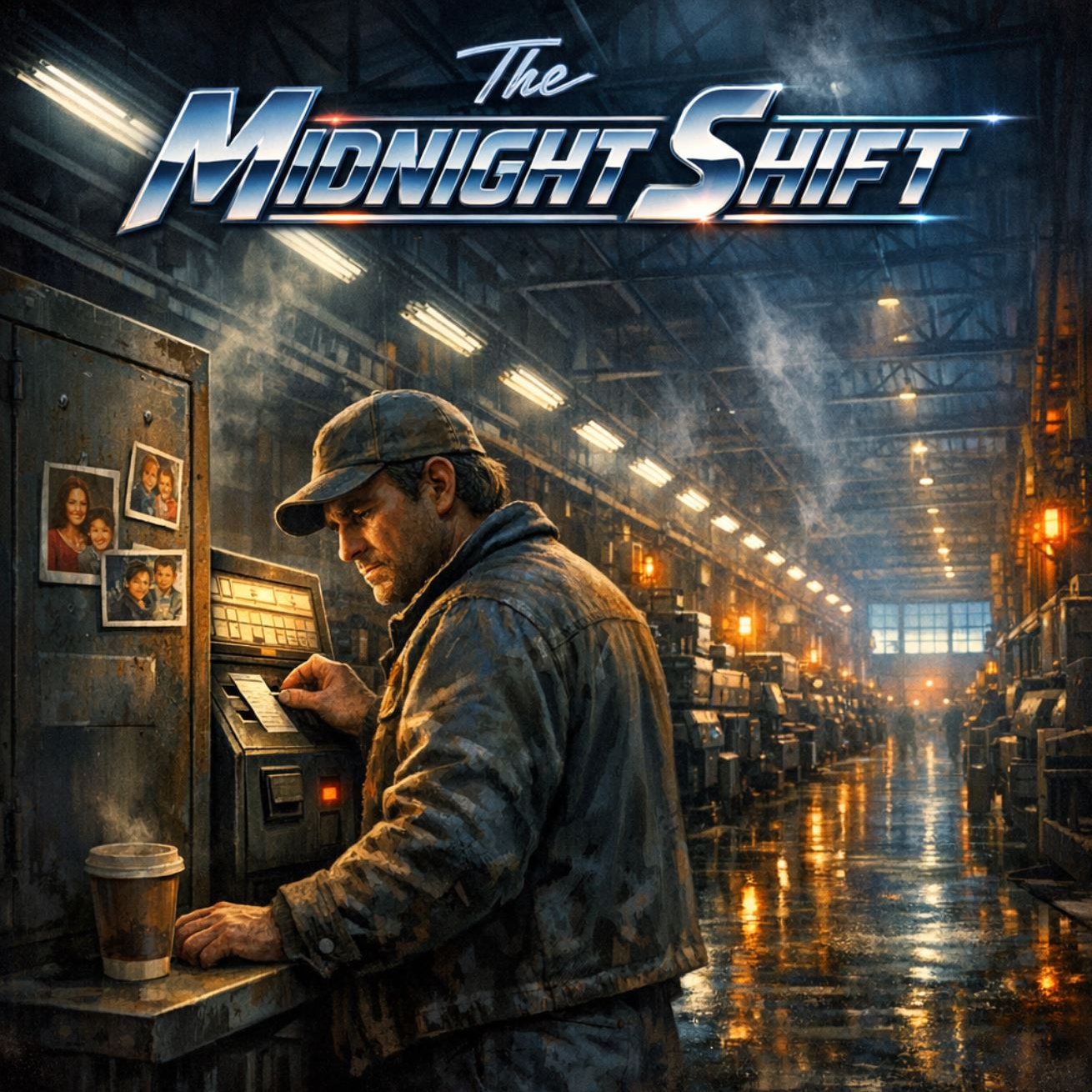 A cinematic and driving 1980s AOR / Work-Rock anthem, Mid-tempo (110 BPM) with a relentless, mechanical rhythm section suggesting the pulse of a factory or a city at night, Features punchy gated reverb drums, a deep melodic bassline, and rhythmic analog synthesizers, The production is polished and wide-screen, Male vocals are gritty, soulful, and powerful, with anthemic, multi-layered harmonies in the chorus reminiscent of classic late-80s melodic rock, Includes a soaring, emotive electric guitar solo with a warm, singing tone, The mood is blue-collar, proud, and slightly melancholic yet deeply resilient, Clean, high-fidelity production with a focus on atmosphere and a strong, steady beat