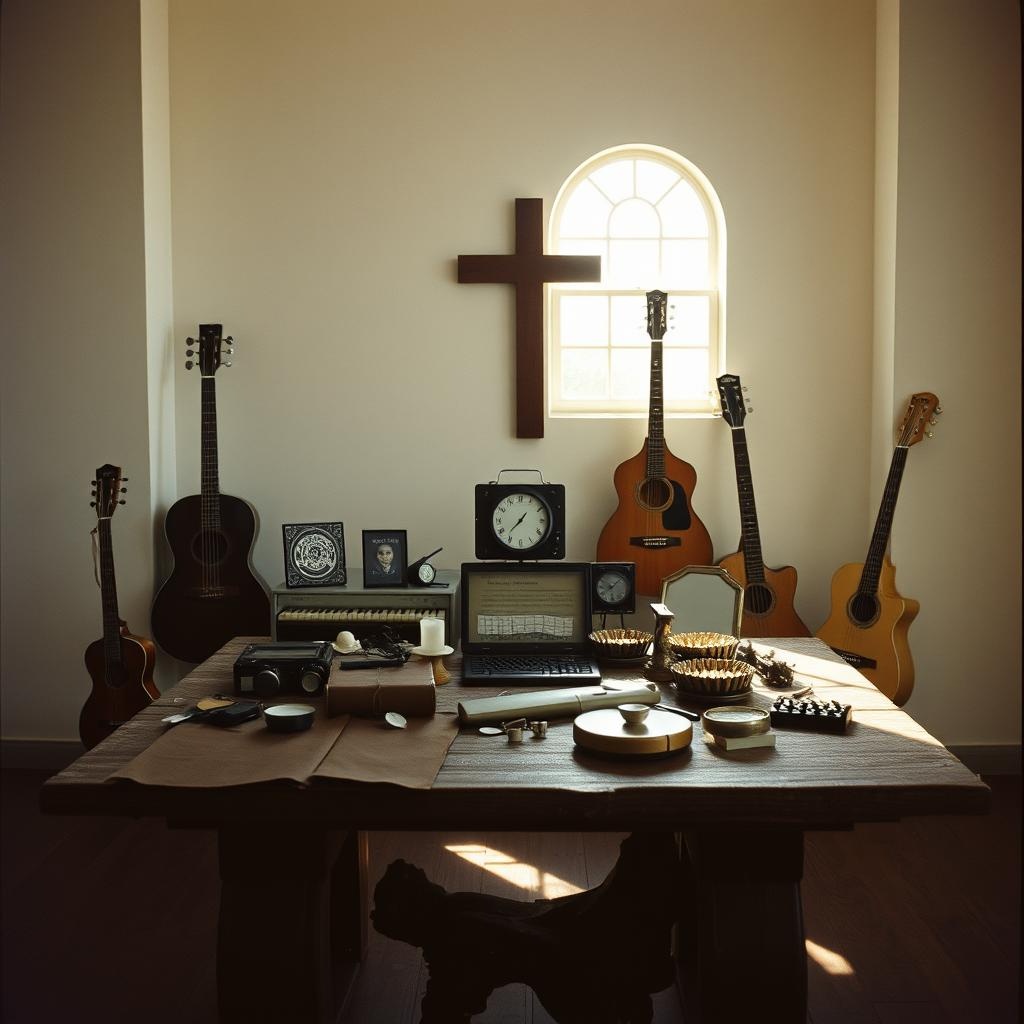 Christian big band swing with bold brass, upright bass, and smooth vocals, Featuring sax, trumpet, trombone, and rich rhythms, blending gospel energy with a vintage 1950s jazz feel