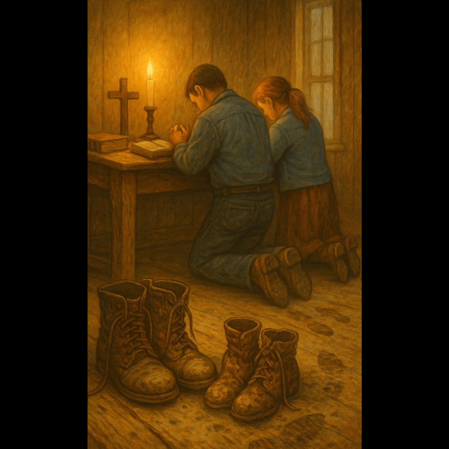 "Southern folk-rock worship with rugged male lead and youthful female harmonies, Acoustic guitar, banjo, upright bass, raw percussion, southern rock energy, earthy vocals, emotional storytelling, "