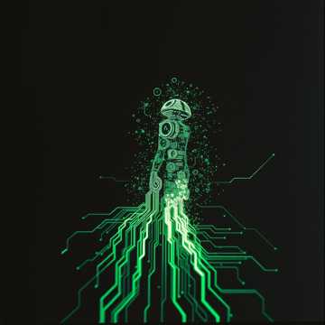an industrial nu-metal band in the style of Powerman-5000, The theme is 'Haptic Collision, ' A futuristic, mechanical human silhouette is disintegrating into glowing digital particles and vibrating circuit patterns, Electric neon green and deep black color palette, Cyberpunk aesthetic with heavy motion blur and glitch effects, High-energy, aggressive, and tech-noir style, "}" }