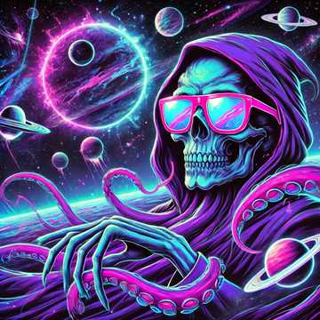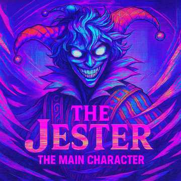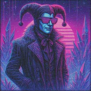 100BPM, 80's synthwave, cyberpunk, alternative rock, electronic, darkwave, deep house, heavy bass, sample, dystopian, polyphonic, hypnagogic, studio quality, The Jester