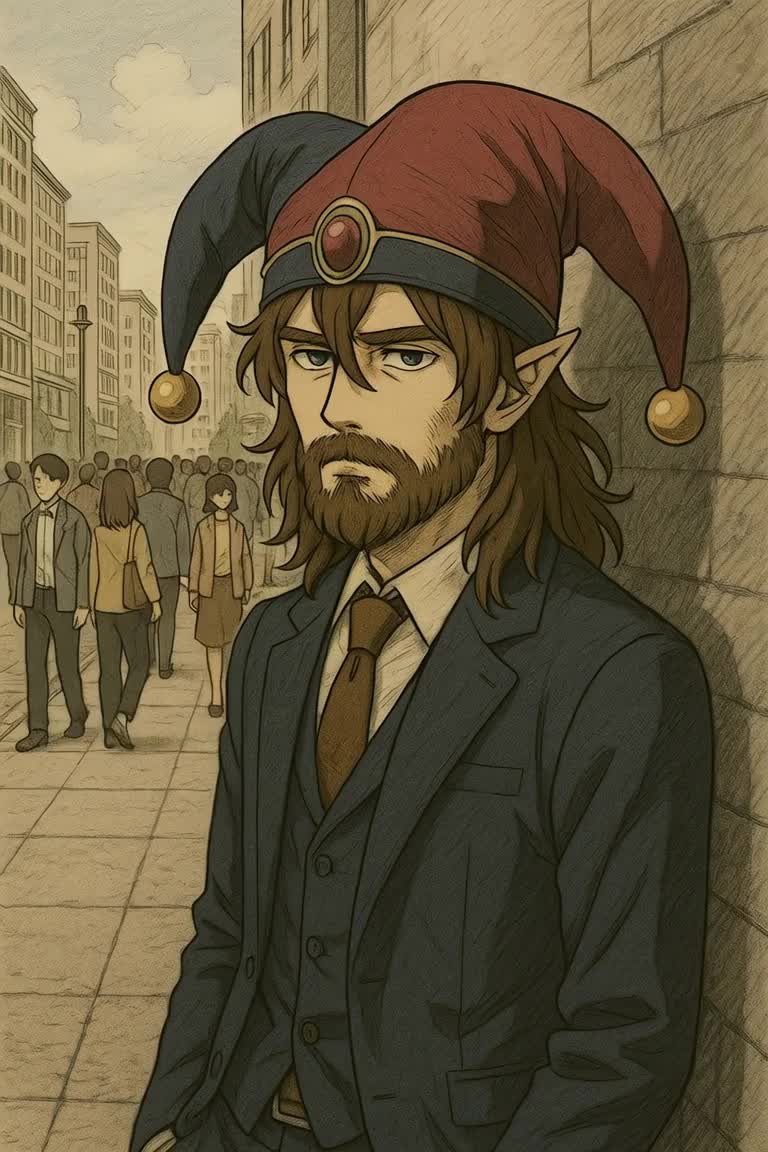 vaporwave, hypnagogic drift, fabloo, dark bubblegum pop, glitchcore, sampled audio, faux-utopian, nostalgic, melancholic, reminiscent, aesthetic, late-night lo-fi, ambient, surreal, relaxing, Jester