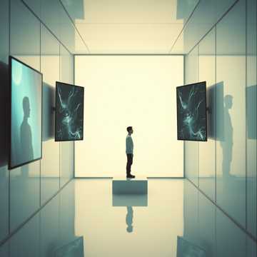 Glacial ambient pads and airy arpeggios, distant choirs glimmering in the high end, Slow, evolving harmony that swells like a tide; subtle sub-bass pulses mark shifts in the scenes, Occasional crystalline bells trace the “threads” of memory, with reverb-soaked vocal textures drifting in and out as wordless melodies, Mix aims for a vast, weightless stereo field where each new layer feels like walking into another aisle of an endless, glowing library, vocal