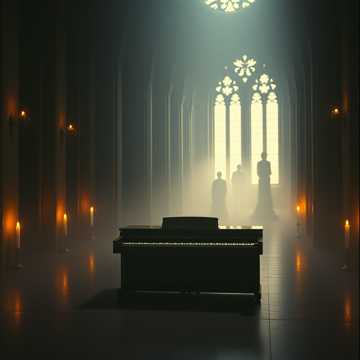 Slow-build cinematic art-pop; male vocals hovering over spacious piano and organic drones, Verses stay hushed with close-mic intimacy, subtle frame creaks and room tone; chorus blooms with low choirs, distant taiko pulses, and swelling strings, Reverb tails hang long, torch-crackle foley tucked wide in the stereo field for a tactile, gallery-at-night feel, ambient, soft, warm