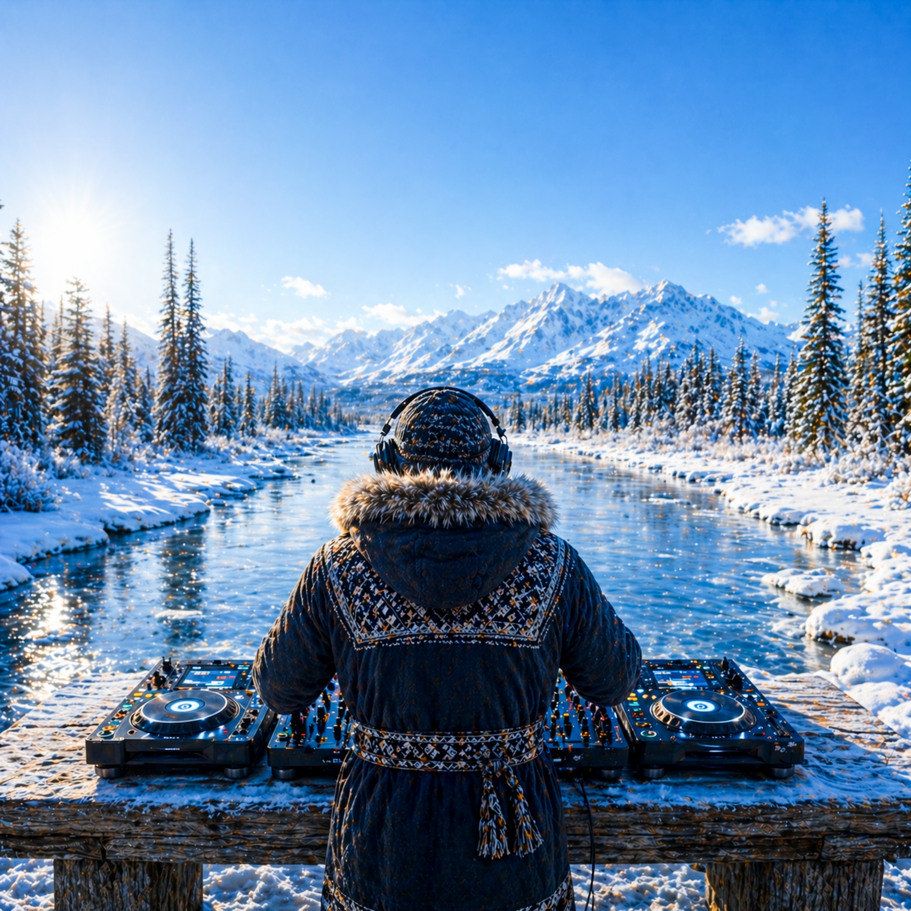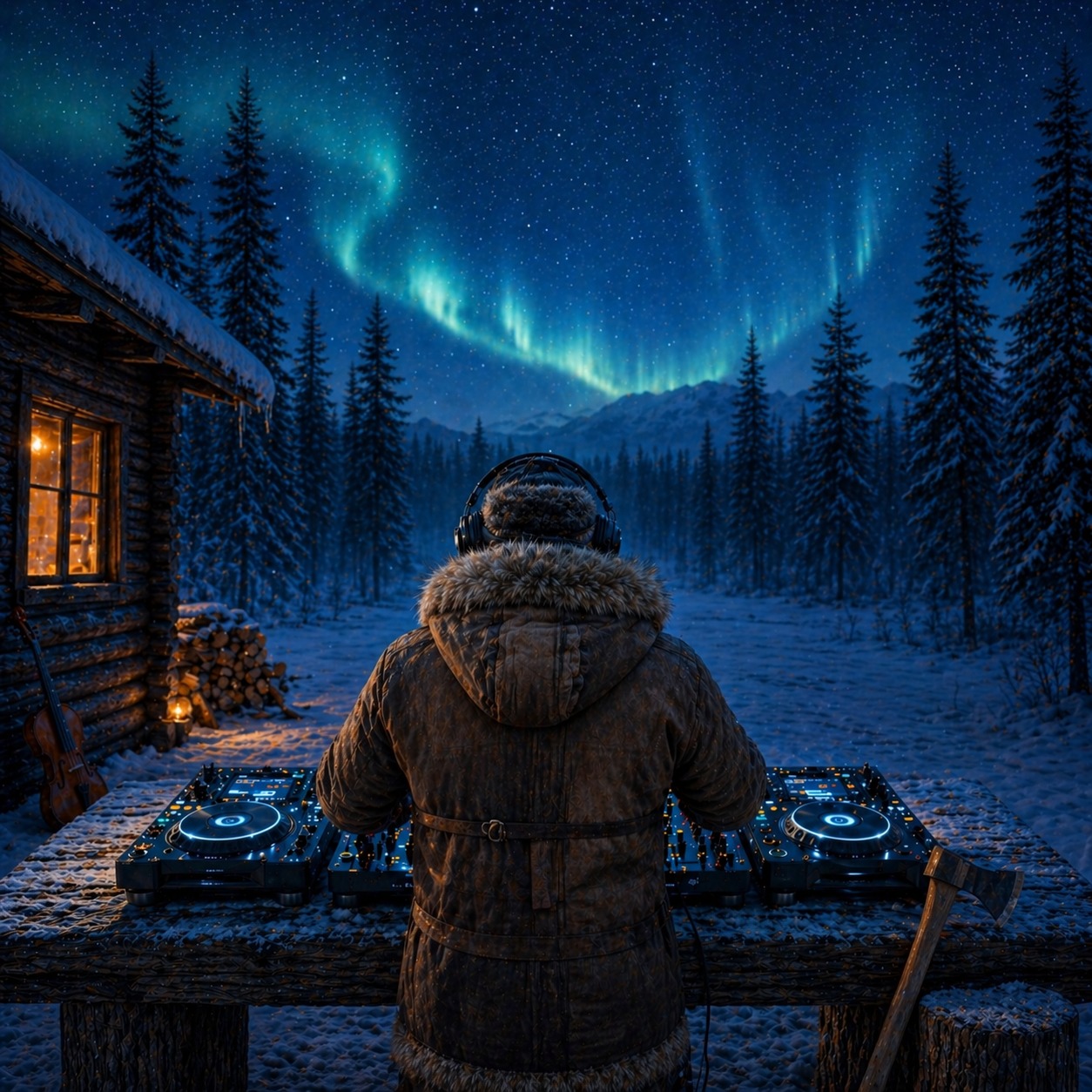 Atmospheric deep house, Canadian far north vibe, axe hits on trees as wooden percussion, Quebec folk fiddle, accordion, native-style flute, frame drums, icy pads, boreal forest ambience, snow footsteps, arctic wind, warm deep bass, hypnotic 122 BPM groove, cinematic aurora borealis mood