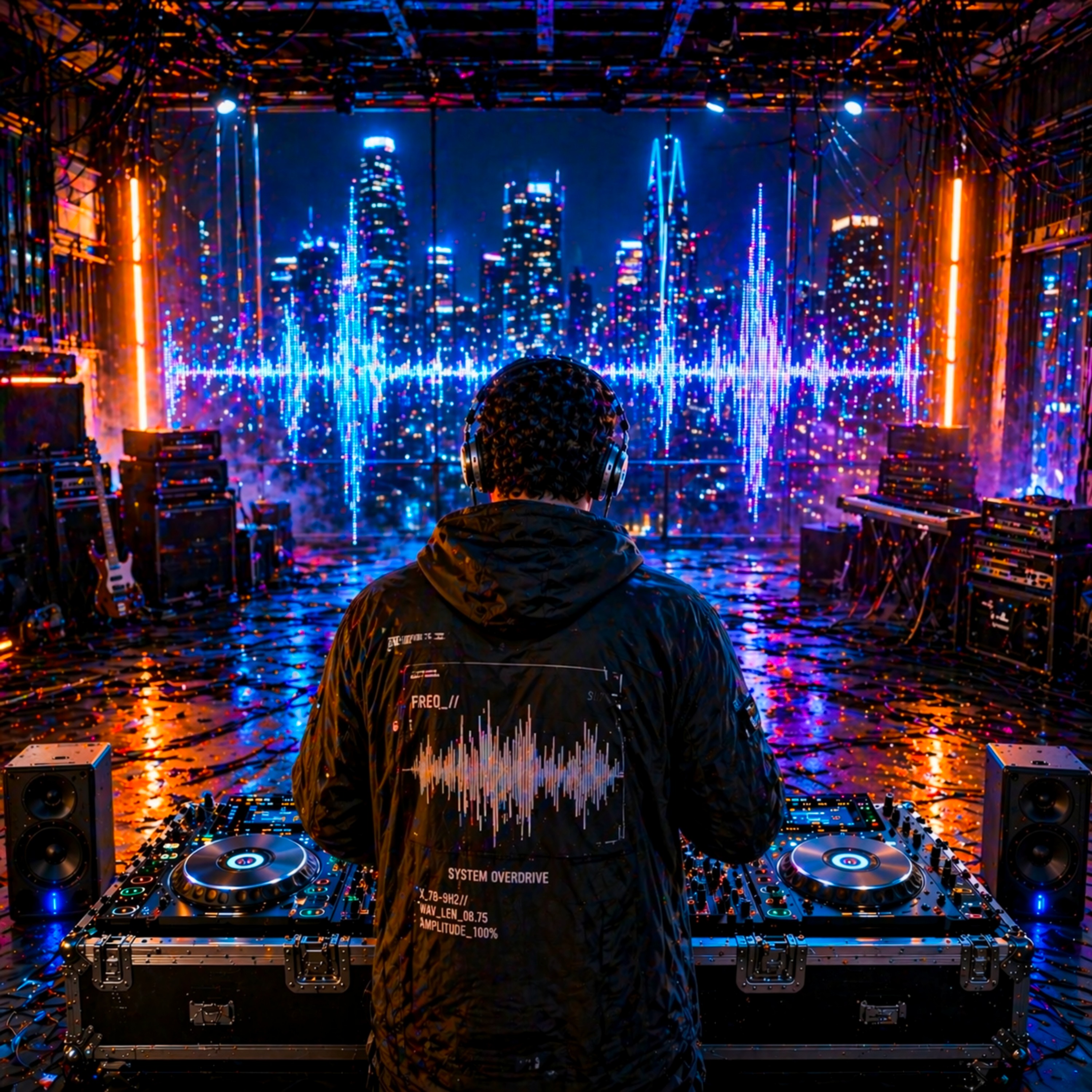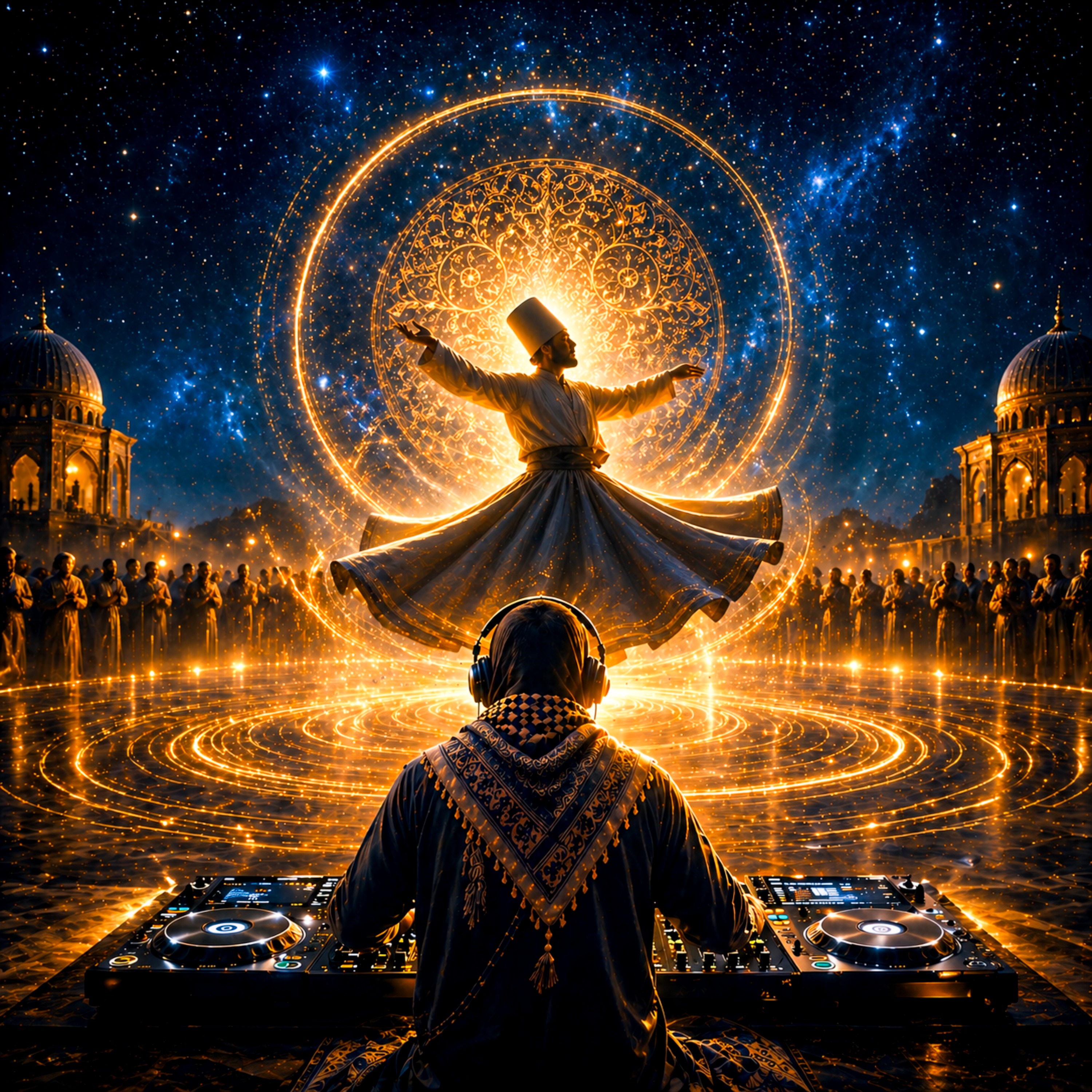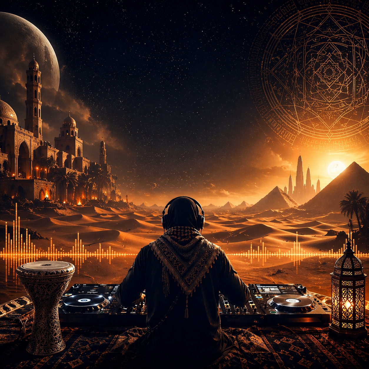 techno, deep house, 124 BPM, darbuka polyrhythm, Arabic maqam lead, oud riff stabs, qanun arpeggios, frame drum accents, sub-bass pulse, sidechain compression, stereo room mic, plate reverb, dub delay, projected vocal hooks, minor key, hypnotic groove, warehouse drive, widescreen mix