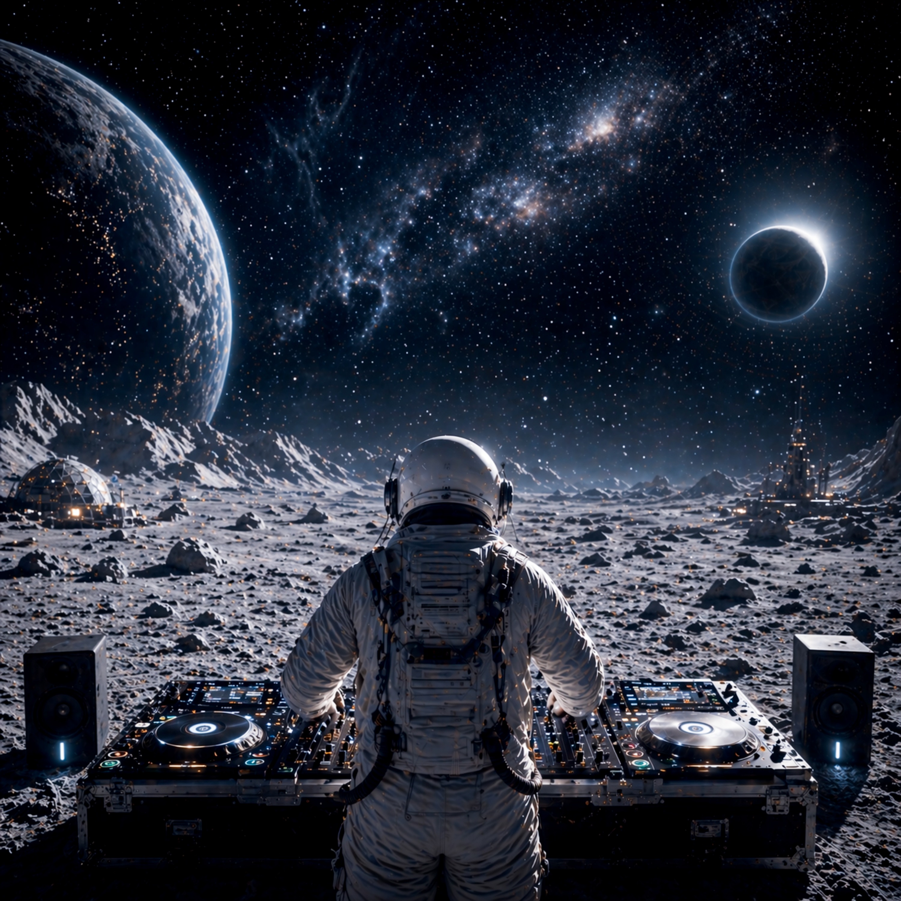 space techno, 124 BPM, driving kick, rolling sub-bass, hypnotic synth pulse, floating atmospheric pads, cosmic arpeggios, airy angelic textures, no vocals, shimmering lead motif, celestial plucks, metallic percussion, soft ride groove, sidechain compression, dub delay, long plate reverb, stereo space echoes, minor key, warehouse drive, weightless breakdowns, zero-gravity tension, widescreen mix