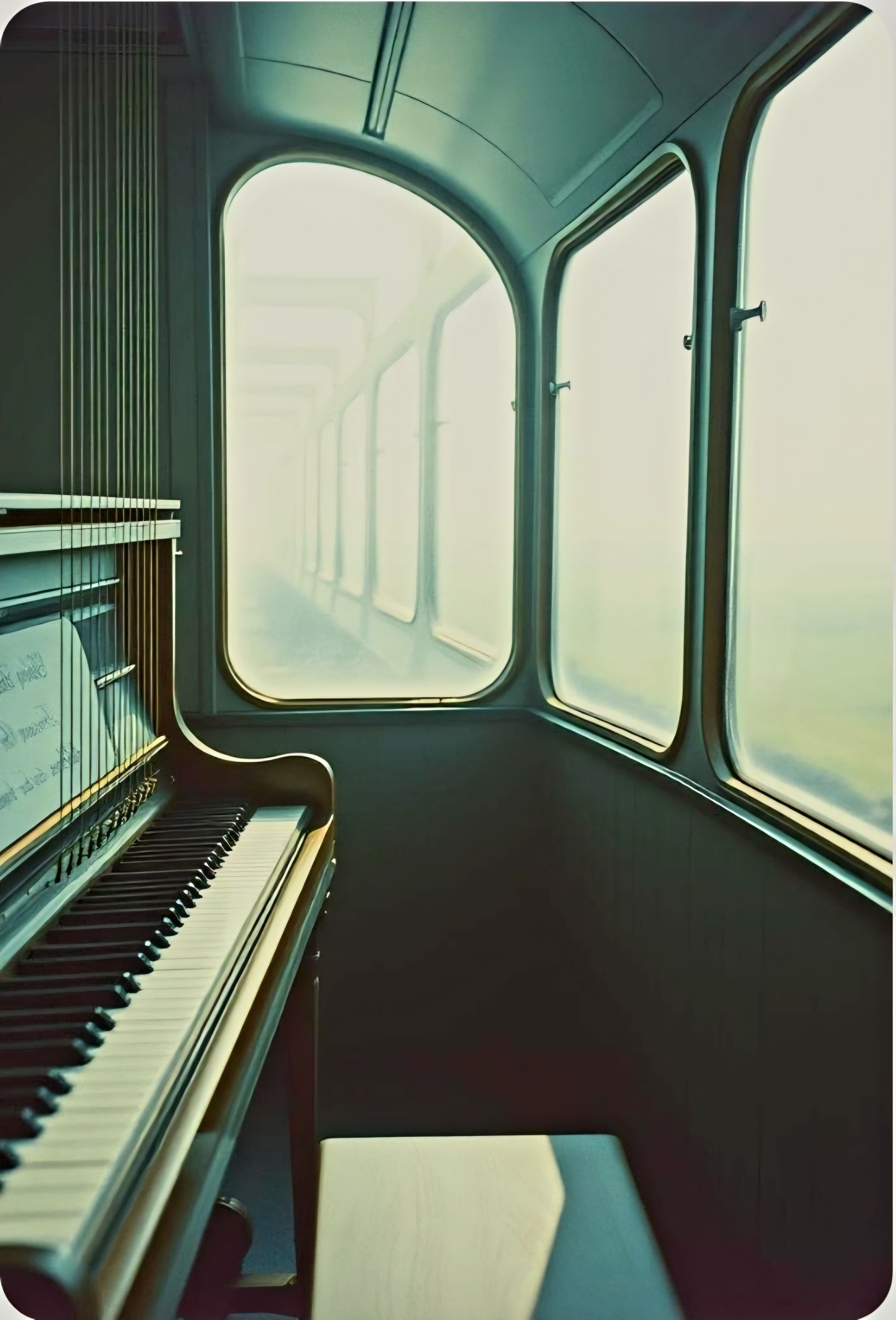 #HookImage: vintage piano on train, mystical and serene, realistic style, high detail