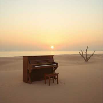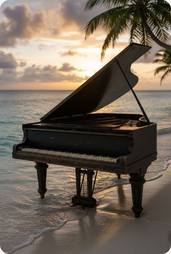#HookImage: vintage piano standing in the middle a desert island, realistic style, high detail