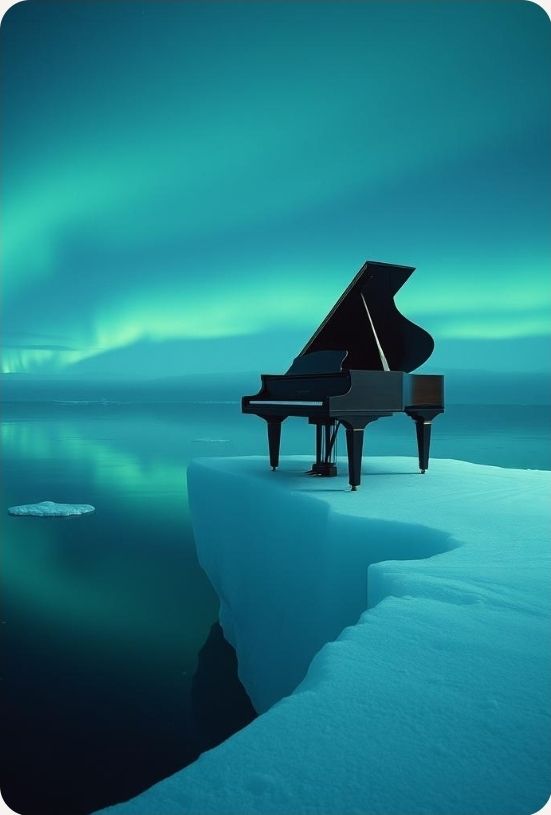 #HookImage: vintage piano on a iceberg, mystical and serene, realistic style, high detail