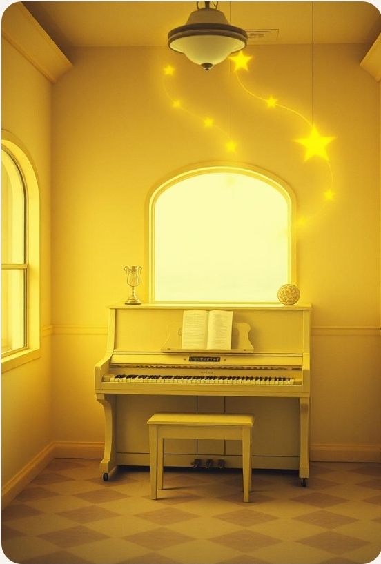 #ReferenceAudio: user_provided #hook image: old vintage piano in a 1950' milkshake restaurant with yellow stars_realistic style_detail epic