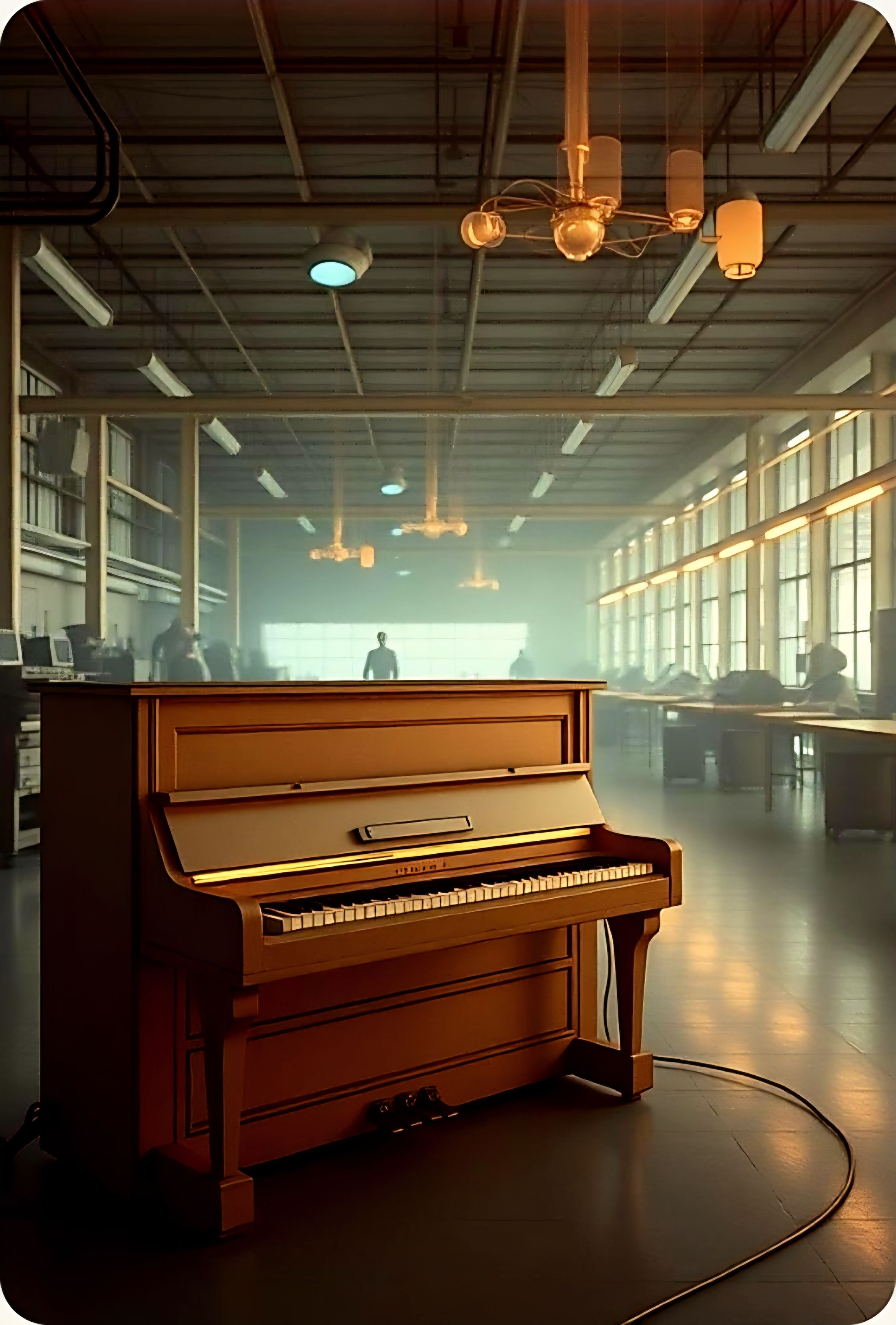 #HookImage: old vintage piano in a robot factory _realistic style, high detail