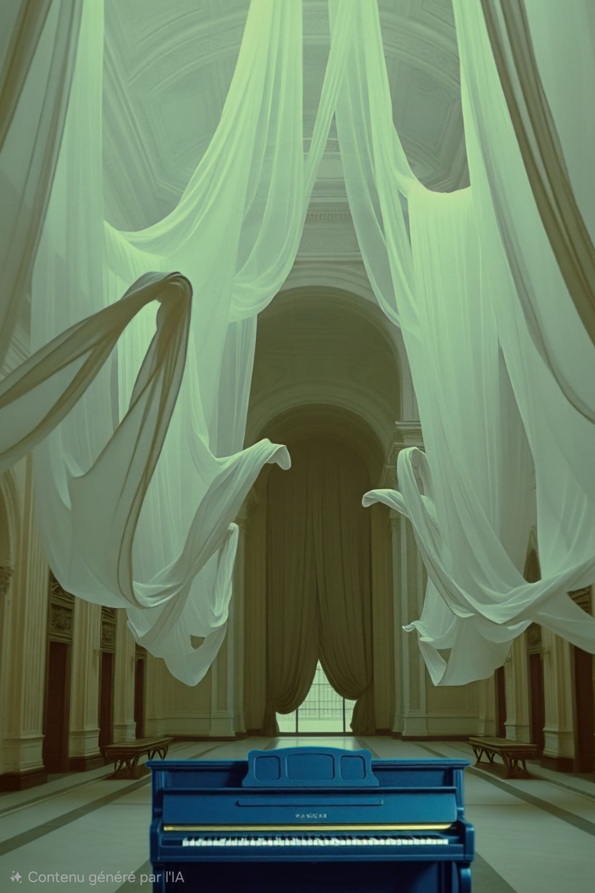 #HookImage: vintage piano standing in the middle of a church whit a pianist, realistic style
