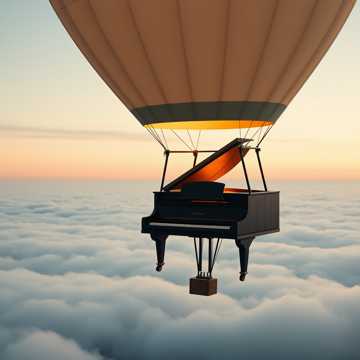 #HookImage: old vintage piano in a hot air ballon_realistic style, high detail