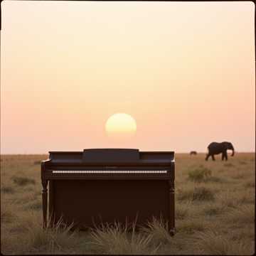 #HookImage: vintage piano standing in the middle of the savane with a éléphant on the back, realistic style, full detail high detail