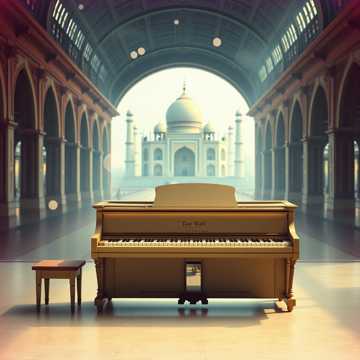#HookImage: vintage piano in front of the Taj Mahal train_ realistic style, high detail