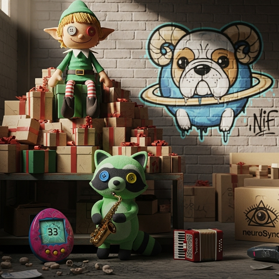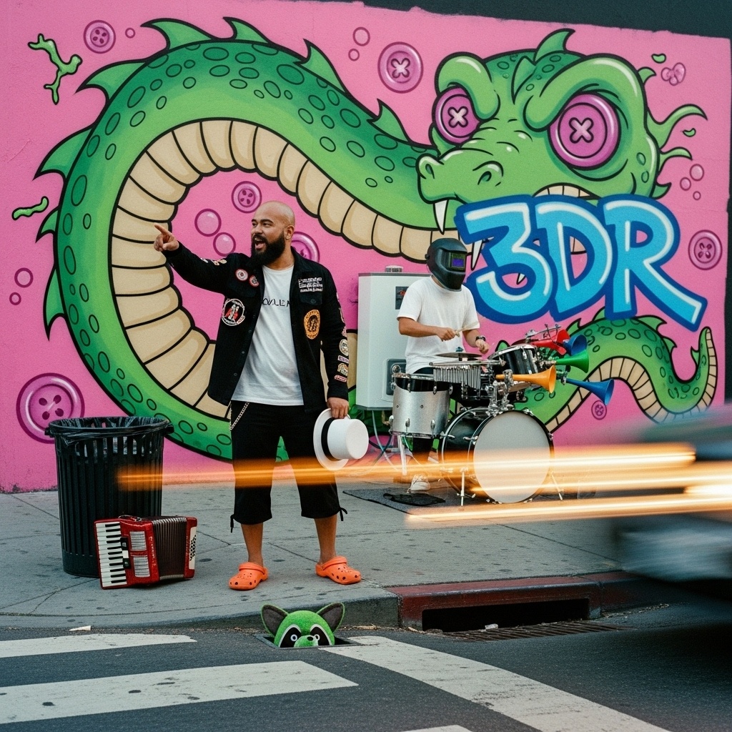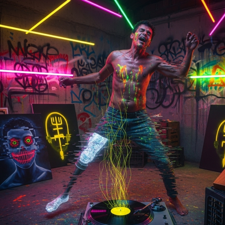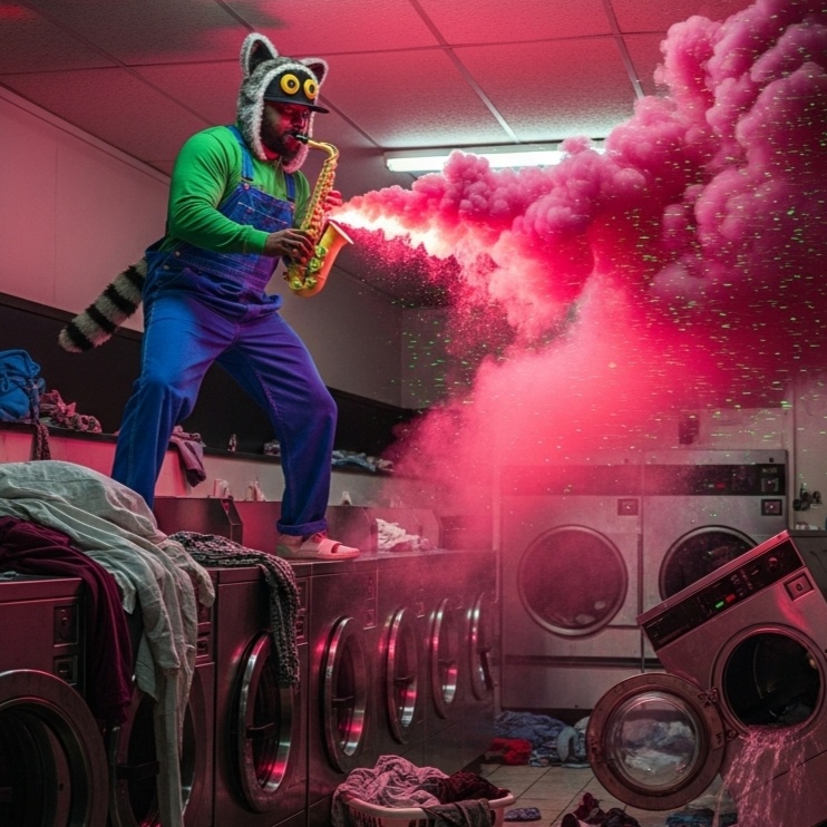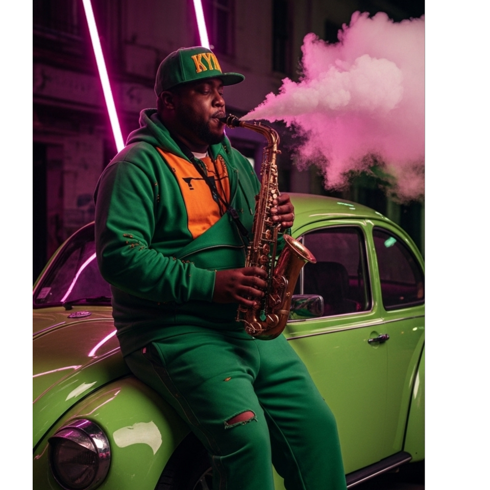 [Style: Cel-Shaded Rave Funk, A hyper-energetic fusion of sweaty funk basslines, surf-rock guitar licks, frantic rave synth stabs, and a hard-hitting hip-hop beat, The vibe is the soundtrack to a final boss battle in a cult classic video game, Dominated by a chaotic, reality-bending toy saxophone that sounds like it's glitching the fabric of the song itself, Insanely danceable, chaotic, and dripping with style, ]