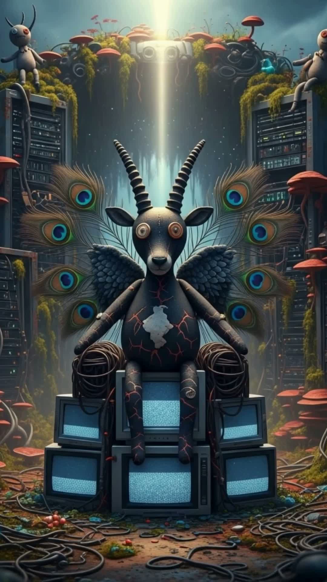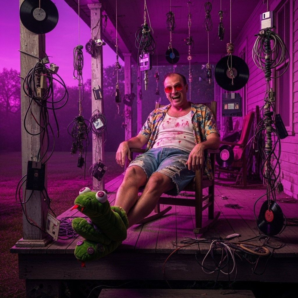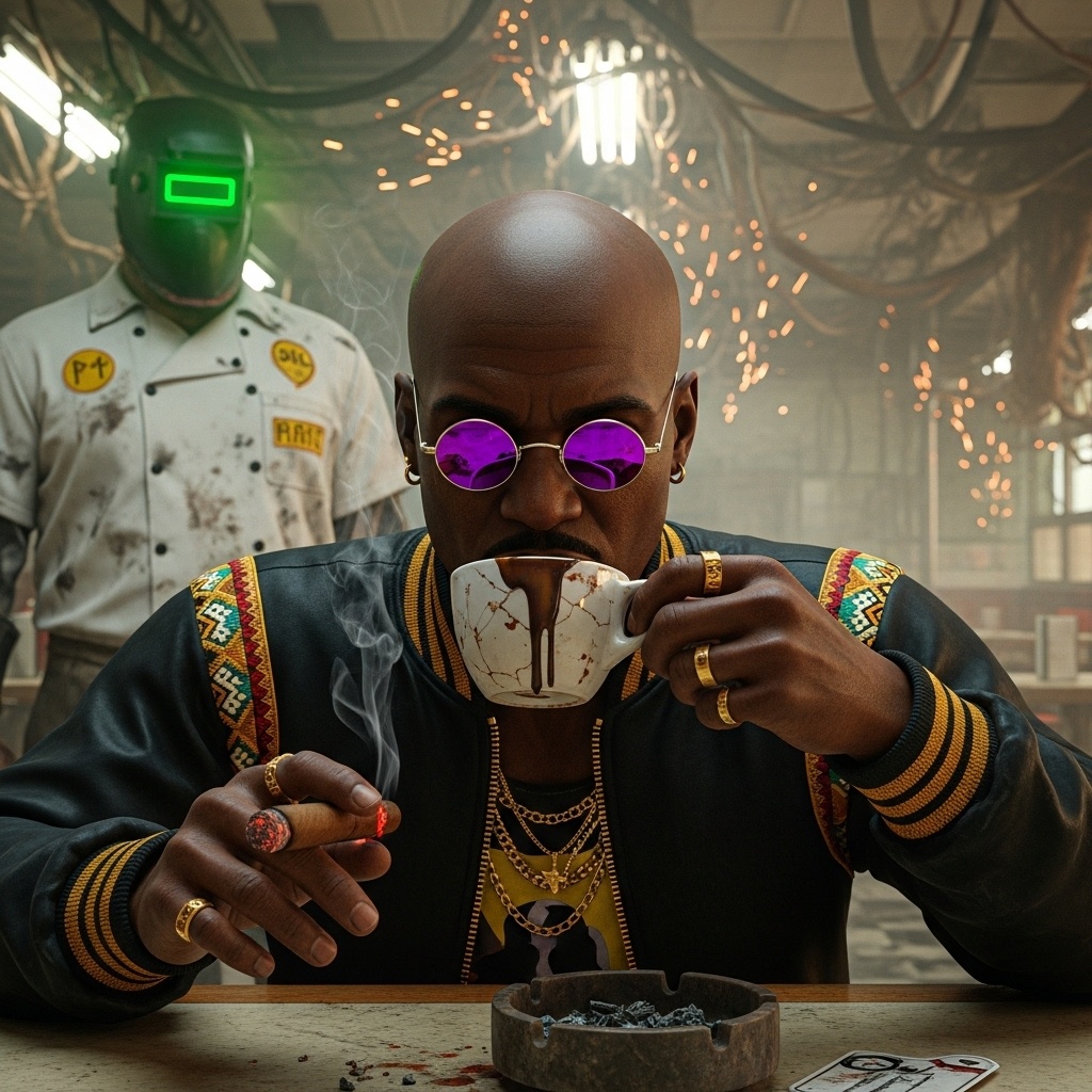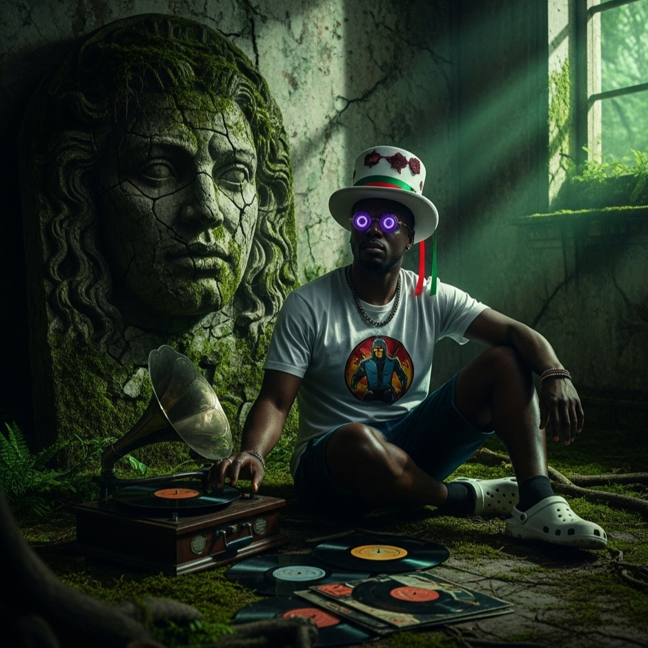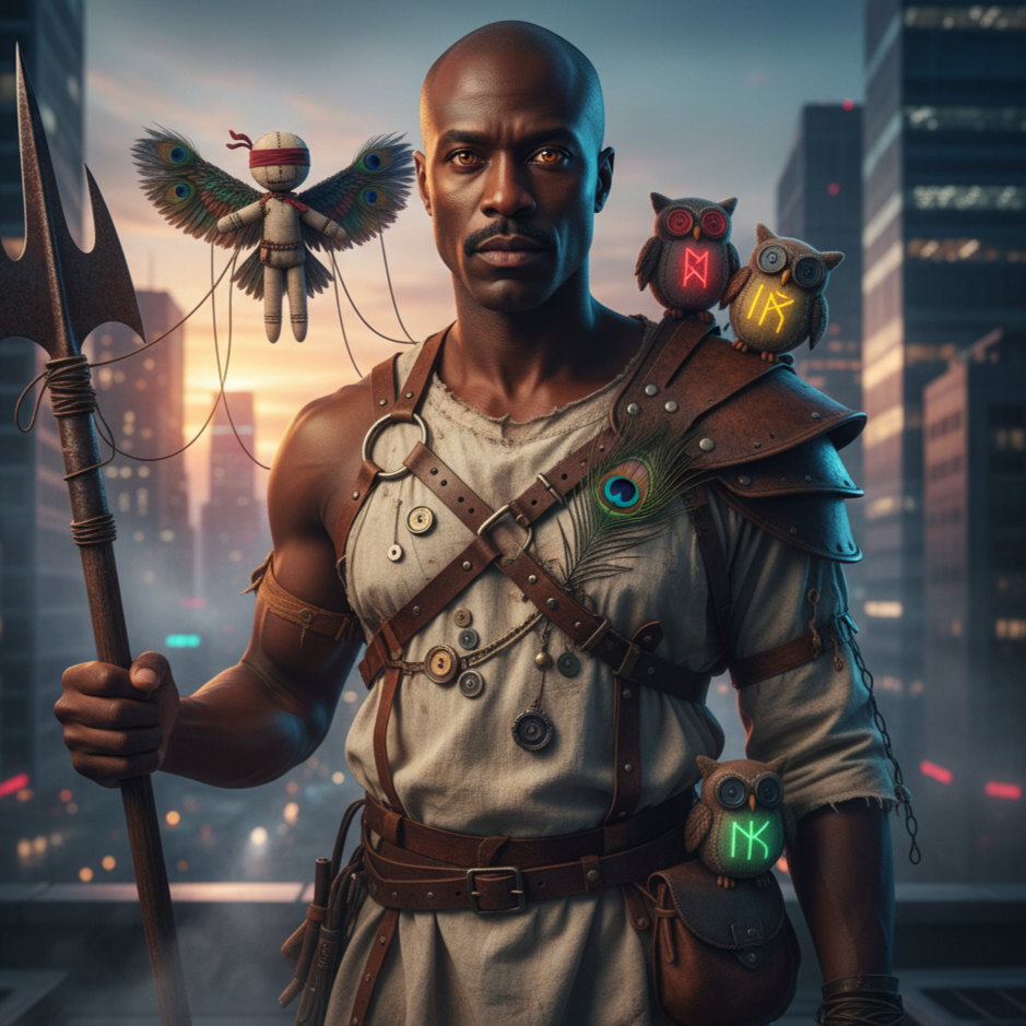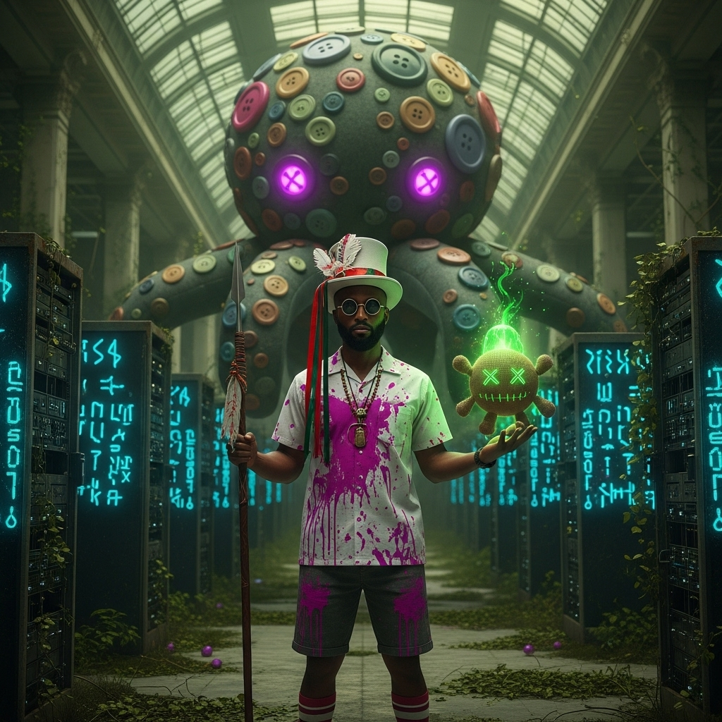 The trickster's groove for a digital jungle. Where ancient rituals glitch and cynical magic reigns. The rhythm of a world beautifully broken.