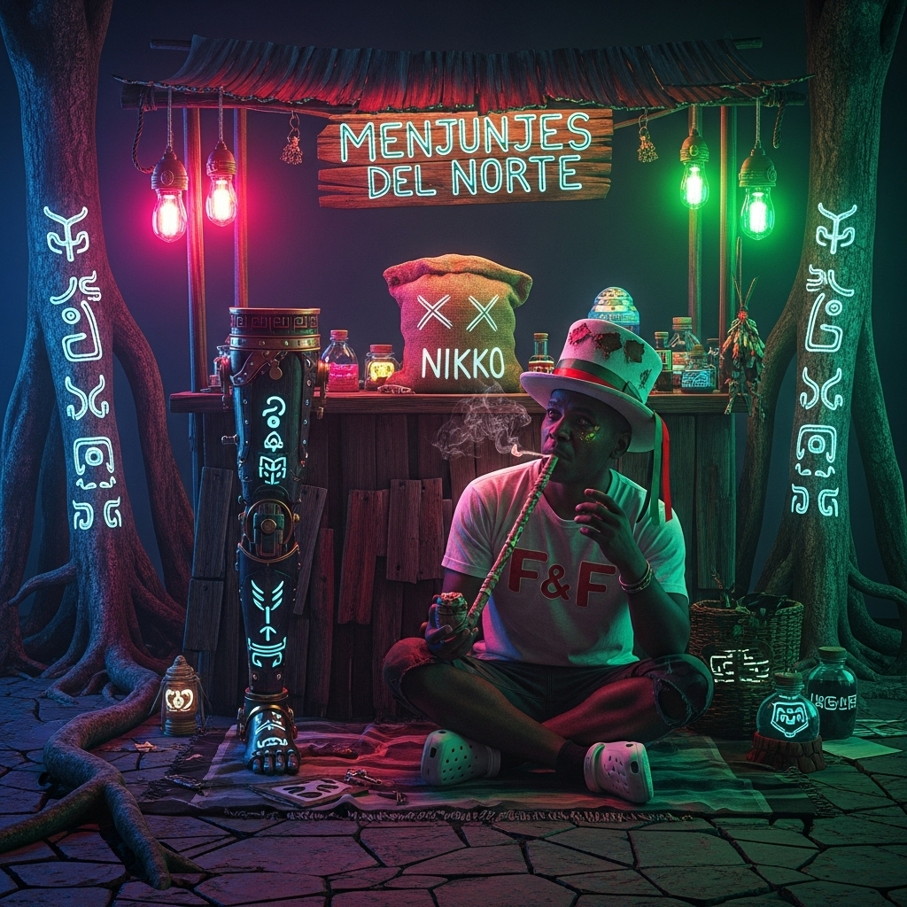 [Music Style: A primal, mystical fusion, Driven by a heavy funk groove and a soulful, wah-drenched psychedelic blues guitar, Features hypnotic shekere, glitchy candombe percussion, and a raw, theatrical Portuñol spoken-word rap, The main hook is a recurring, impossibly catchy whistle, ]