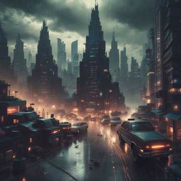 Sirens, rain, lo-fi, pomp, computer noises, slow beats, square wave, sinister build