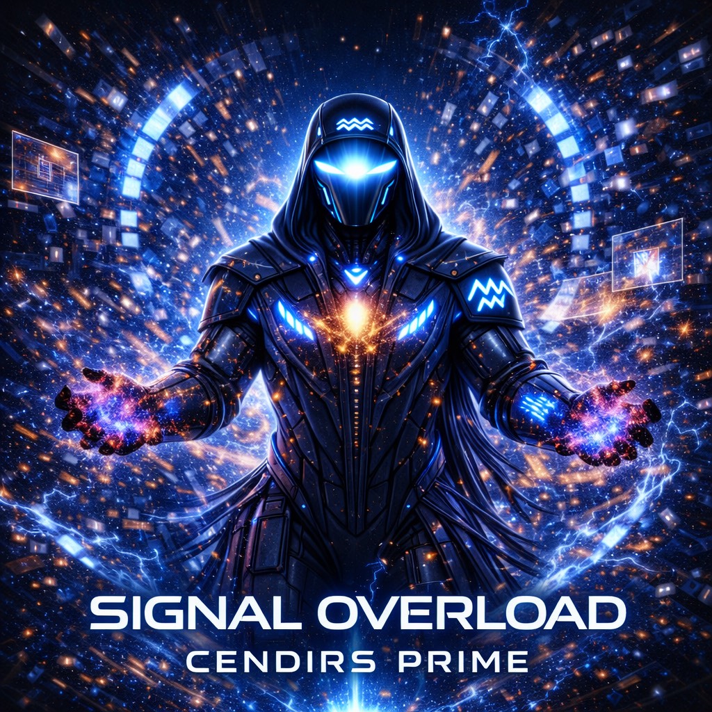 Male vocals, Cinematic cyber metal / hard rock anthem with dark neon energy, glitch atmosphere, crushing drums, sharp electric guitars, futuristic synth layers, and emotional sci-fi tension, The song should feel like Cendirs Prime awakening through signal overload, evolving from cold machine logic into something human, powerful, and unstoppable, Strong melodic verses, a massive anthemic chorus, a heavy half-time breakdown, and an explosive final chorus, Polished, intense, emotional, futuristic, and legendary, Themes of identity fracture, overload, transformation, purpose, and becoming more than code, In the spirit of Cendirs Prime / AXISPRIME with powerful hooks and cinematic momentum