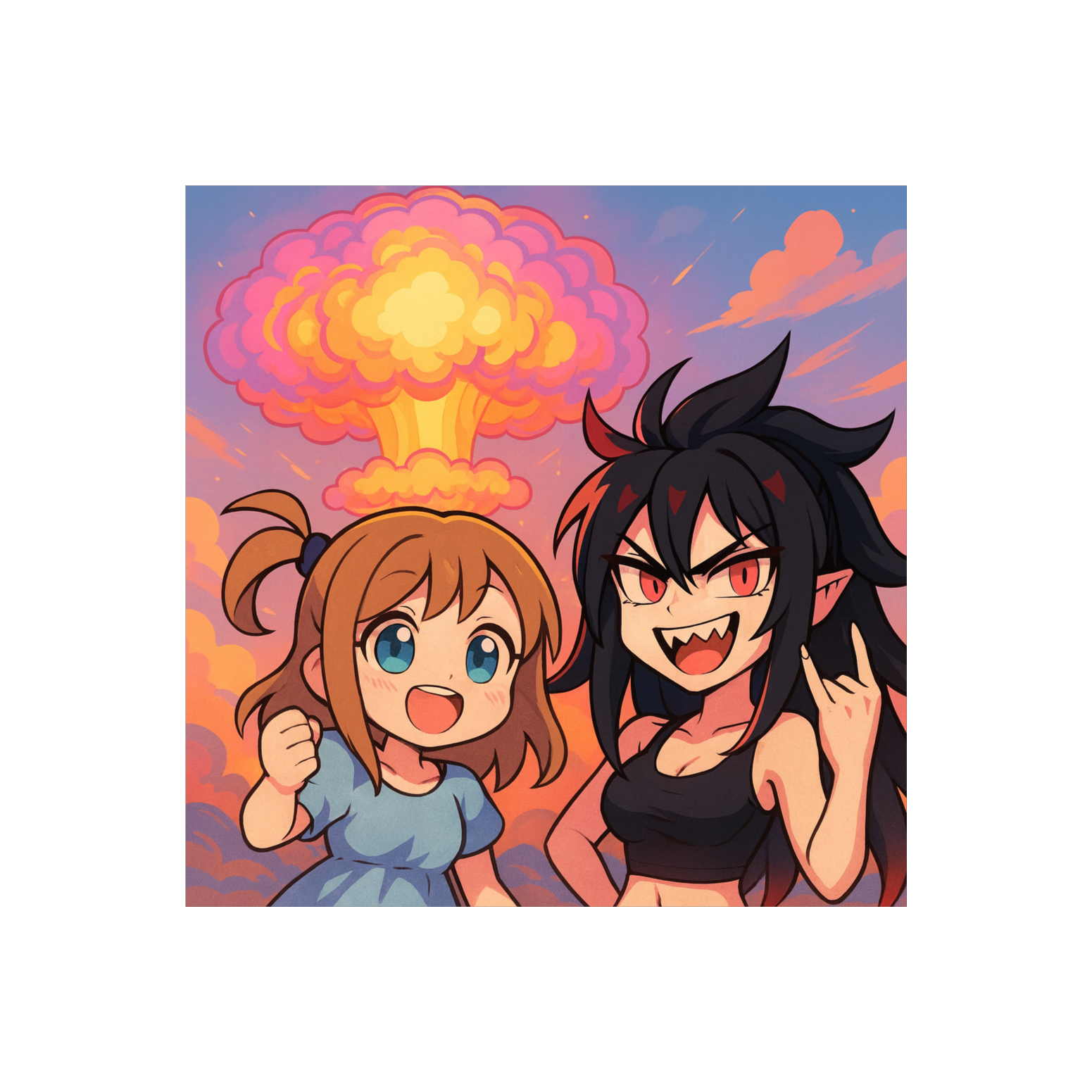 Kawaii metal / glitchcore / j-rock / nu metal fusion at 100 BPM, the song opens with glitchy ambient pads and playful 808 trap beats, before surging into down-tuned chug guitars and aggressive blast beats, Chibi’s bright J-pop vocals play off Brat’s raw screams, toggling section by section, Layers of sharp fx distortions accentuate the chaos, with sudden drops to manic, hyperactive electronics, building tension between innocence and destruction before each explosive, cinematic chorus, All elements remain clear in the mix despite the intrusive, soundtrack-ready sound design