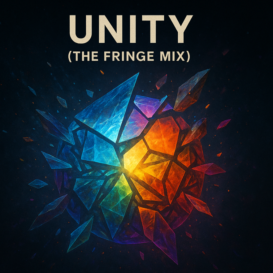 hybrid track blending hip-hop beats, rock guitars, pop synths, Latin percussion, gospel choir, metal breakdown, techno pulse, hyperpop glitch, and country twang, Tempo 120 BPM, key of C minor, Vocals unite the hook: “We are one, from many sounds, ” Mood is powerful, global, and unifying