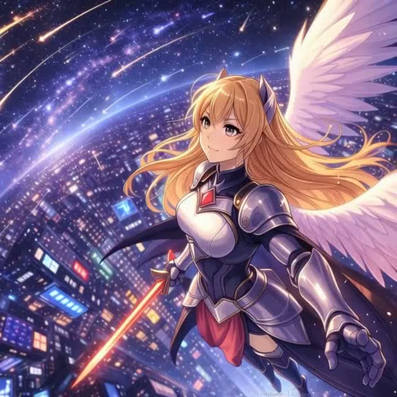 Epic night-city J-Pop anime opening with heroic cat-eared valkyrie idol vibe, BPM 148-154, 4/4 driving beat light swing, Consistent volume throughout, no dynamic swell, balanced loudness all sections, no compression buildup, Verses build intimately from lonely skyline melancholy to soaring hopeful choruses without volume spikes, Tight J-pop drums, driving electric bass, piano arpeggios, shimmering synth pads, lush strings for epic lifts, light overdriven guitar accents, reverse FX risers, wide clean reverb, cinematic texture, Japanese female vocal: cat-idol elegance with "にゃん♡" "ラベにゃー!" phrases, soft verses, powerful clean choruses, layered harmonies, no shouting/humming/random ad-libs