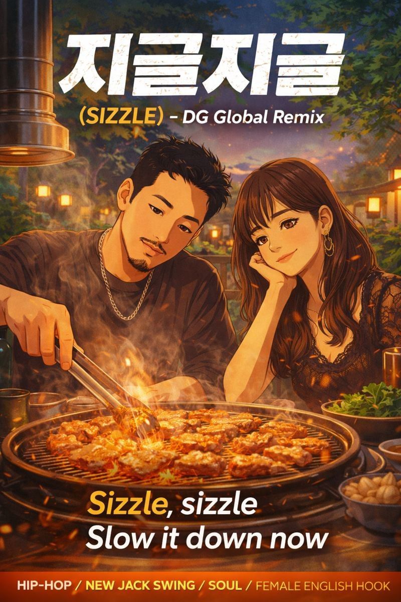 A modern hip-hop and new jack swing track with a clean, minimal rap verse and a highly addictive DG-style female vocal hook, Tempo around 95 BPM, groovy and laid-back, Male rapper delivers calm, tight Korean rap with plenty of space and confidence, Chorus is sung by a female vocalist in English, breathy and husky tone, repeating simple phrases like “Sizzle, sizzle, slow it down, let it melt now, ”