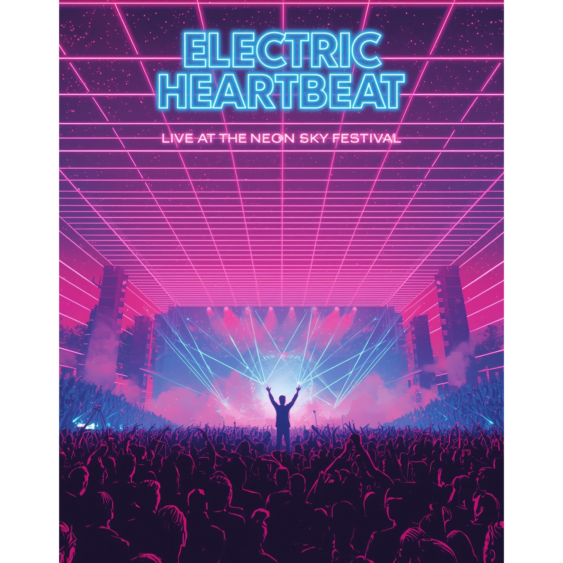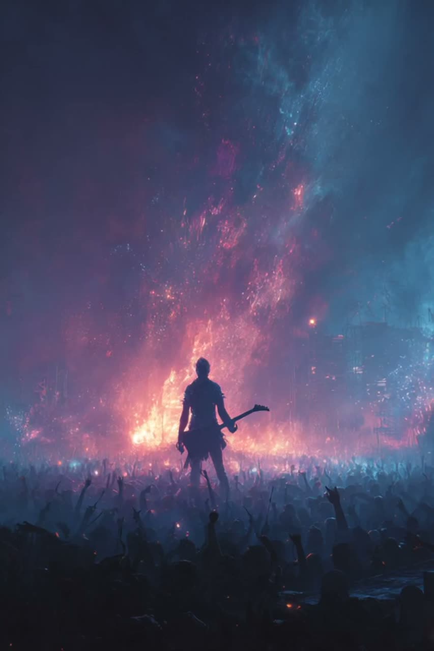 Live stadium version of a high-energy 80s-inspired power metal and retrowave anthem, Massive crowd ambience with roaring audience chants, rhythmic clapping, and live pyrotechnic atmosphere, The music fuses melodic electric guitars, bright synth arpeggios, cinematic strings, and thunderous drums, Epic production with a clean, modern mix—tight basslines, soaring vocals, and grand symphonic layers, The chorus features full audience sing-alongs and echo responses, evoking euphoria and unity, Energetic, uplifting, and emotional — the perfect fusion of retro neon spirit, metal power, and cinematic grandeur performed live before hundreds of thousands of ecstatic fans
